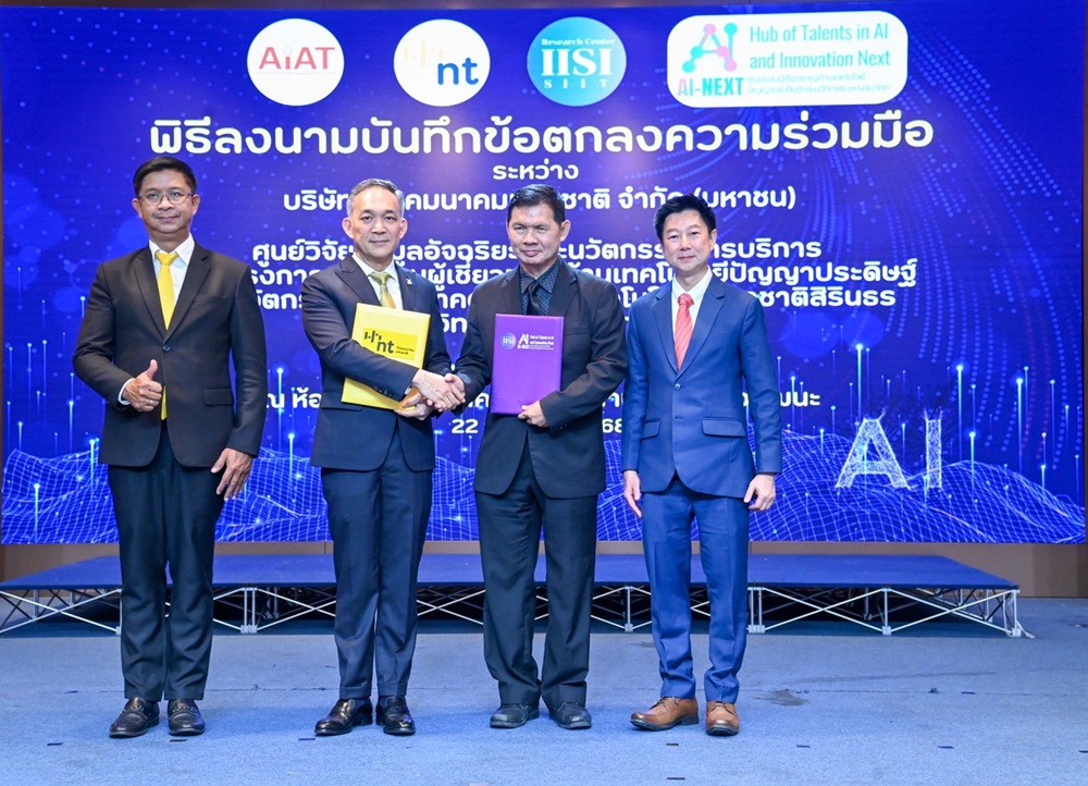 พันเอก สรรพชัยย์ หุวะนันทน์ กรรมการผู้จัดการใหญ่ บริษัท โทรคมนาคมแห่งชาติ จำกัด (มหาชน) (NT) ลงนามบันทึกข้อตกลงความร่วมมือ (MOU) ด้านเทคโนโลยีวิทยาการข้อมูลนวัตกรรมและปัญญาประดิษฐ์ ร่วมกับ ศูนย์วิจัยข้อมูลอัจฉริยะและนวัตกรรมการบริการ (IISI) โดย ศาสตราจารย์ ดร.ธนารักษ์ ธีระมั่นคง และ โครงการศูนย์รวมผู้เชี่ยวชาญด้านเทคโนโลยีปัญญาประดิษฐ์และนวัตกรรมแห่งอนาคต (Hub of Talents in AI and Innovation Next (AI-Next) ภายใต้สถาบันเทคโนโลยีนานาชาติสิรินธร มหาวิทยาลัยธรรมศาสตร์ โดย รองศาสตราจารย์ ดร.ธีรยุทธ โหรานนท์ และ สมาคมปัญญาประดิษฐ์ประเทศไทย (AIAT) โดย ดร.เทพชัย ทรัพย์นิธิ เพื่อการต่อยอดความร่วมมือพัฒนาโครงการด้านเอไอ ณ ห้องจัดเลี้ยง อาคาร 9 สำนักงาน NT แจ้งวัฒนะ