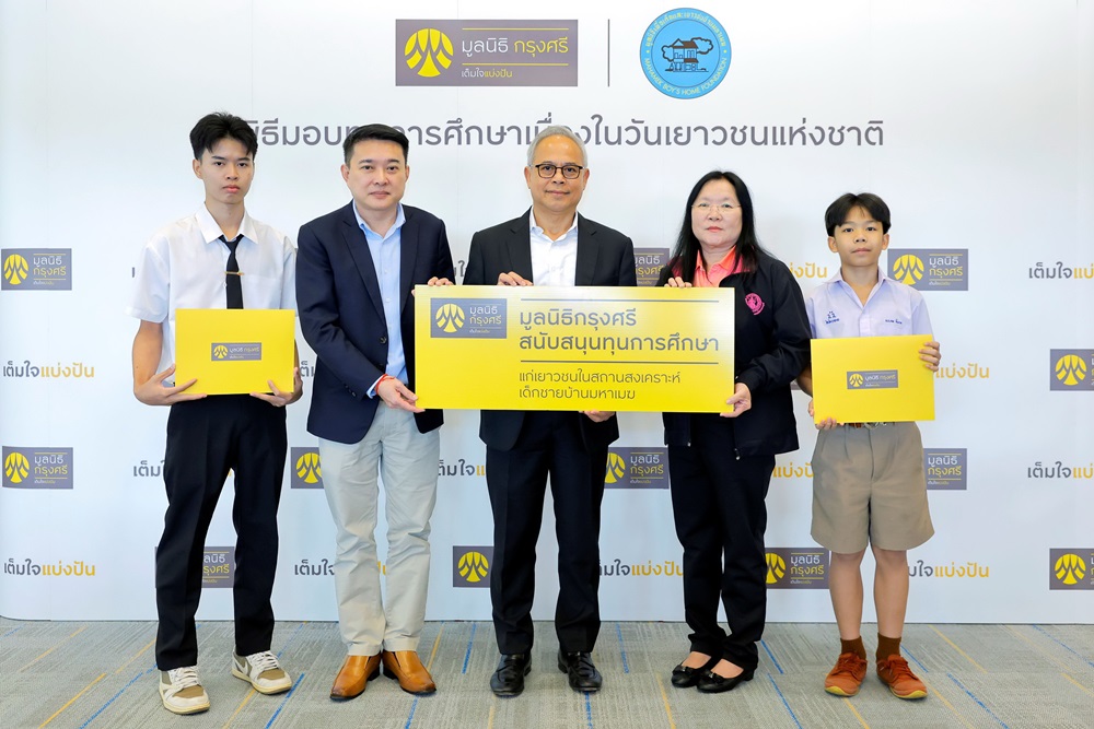 มูลนิธิกรุงศรี โดย นายไพโรจน์ ชื่นครุฑ (กลาง) ประธานคณะเจ้าหน้าที่ด้านกลยุทธ์และวางแผนธุรกิจองค์กร ธนาคารกรุงศรีอยุธยา จํากัด (มหาชน) ในฐานะผู้แทนมูลนิธิกรุงศรี มอบทุนการศึกษาจํานวน 110,000 บาท แก่เยาวชนที่มีผลการเรียนและความประพฤติดีในความดูแลของสถานสงเคราะห์เด็กชายบ้านมหาเมฆ เนื่องในโอกาสวันเยาวชนแห่งชาติ ประจําปี 2568 ณ อาคารริมน้ำ สำนักงานใหญ่ กรุงศรี ทั้งนี้ มูลนิธิกรุงศรีได้มอบทุนการศึกษาเพื่อสร้างโอกาสทางการศึกษาแก่เยาวชนจากสถานสงเคราะห์เด็กชายบ้านมหาเมฆมาอย่างต่อเนื่องเป็นปีที่ 8 โดยมีเยาวชนได้รับทุนการศึกษาทั้งสิ้น 120 ทุน