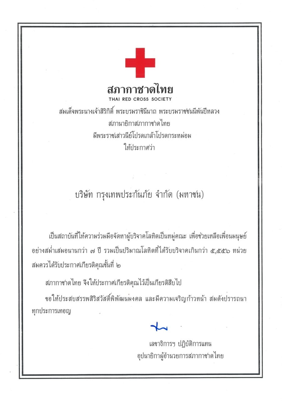 บริษัท กรุงเทพประกันภัย จำกัด (มหาชน) ได้รับใบประกาศเกียรติคุณชั้นที่ 2 จากสภากาชาดไทย ในฐานะองค์กรที่ให้การสนับสนุนและความร่วมมือในการจัดหาผู้บริจาคโลหิตเป็นหมู่คณะอย่างต่อเนื่อง โดยบริษัทฯ ได้ดำเนินโครงการบริจาคโลหิตมาตั้งแต่ปี 2531 และจัดกิจกรรมทุก 3 เดือน เพื่อสนับสนุนการสำรองโลหิตให้เพียงพอสำหรับการรักษาผู้ป่วยในโรงพยาบาลต่างๆ ทั่วประเทศ ถือเป็นการต่อชีวิตและยกระดับคุณภาพชีวิตที่ดีของคนในสังคม ควบคู่ไปกับการขับเคลื่อนนโยบายพัฒนาองค์กรอย่างยั่งยืน