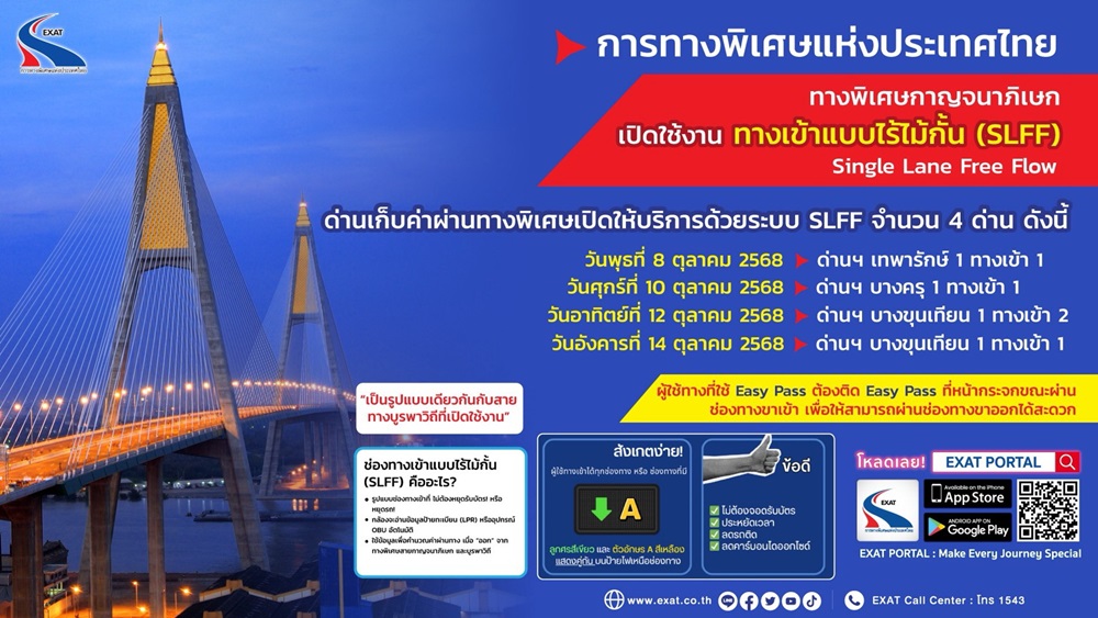 ศูนย์บริการข้อมูลการทางพิเศษแห่งประเทศไทย (EXAT Call Center) โทร. 1543 ตลอด 24 ชั่วโมง หรือดาวน์โหลดแอปพลิเคชัน EXAT Portal