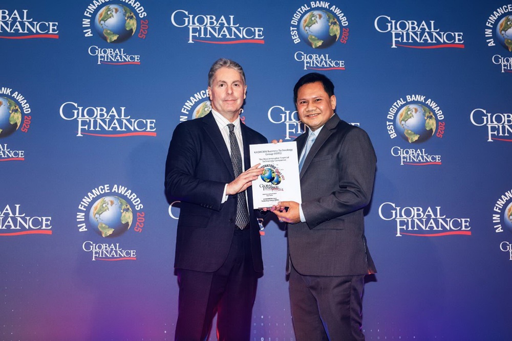 นายเรืองโรจน์ พูนผล (ขวา) ประธานกลุ่มบริษัท กสิกร บิซิเนส-เทคโนโลยี กรุ๊ป (KBTG) เป็นผู้แทน KBTG รับรางวัล The Innovators 2025 ในสาขาบริษัทเทคโนโลยีทางการเงินที่มีนวัตกรรมโดดเด่นที่สุดในภูมิภาคเอเชียแปซิฟิก ประจำปี 2025 (Most Innovative Financial Technology Company in Asia-Pacific 2025) โดยเป็นครั้งแรกที่องค์กรไทยได้รับรางวัลในสาขานี้ จากความสำเร็จในการพัฒนาโซลูชันเทคโนโลยีที่พลิกโฉมการให้บริการของธนาคารกสิกรไทย และยกระดับประสบการณ์ของผู้ใช้บริการทางการเงินทั่วประเทศ โดยมี Mr.Chris Giarraputo (ซ้าย), Managing Director, Operations เป็นผู้มอบ จากงาน World’s Best Digital Bank & AI Awards Ceremony จัดโดยนิตยสาร Global Finance นิตยสารสื่อการเงินชั้นนำของโลก ณ กรุงลอนดอน ประเทศอังกฤษ เมื่อเร็วๆ นี้