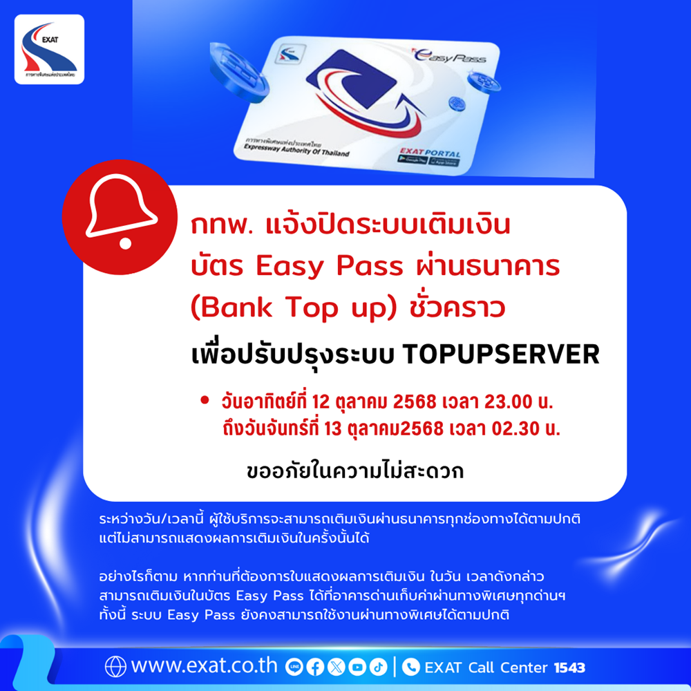การทางพิเศษแห่งประเทศไทย (กทพ.) ขอแจ้ง ปิดระบบเติมเงินบัตร Easy Pass ผ่านธนาคาร (Bank Top up) ชั่วคราว เพื่อปรับปรุงระบบ TOPUPSERVER ในวันอาทิตย์ที่ 12 ตุลาคม 2568 เวลา 23.00 น. ถึงวันจันทร์ที่ 13 ตุลาคม 2568 เวลา 02.30 น. ระหว่างวัน/เวลานี้ ผู้ใช้บริการจะสามารถเติมเงินผ่านธนาคารทุกช่องทางได้ตามปกติ แต่ไม่สามารถแสดงผลการเติมเงินในครั้งนั้นได้ อย่างไรก็ตามหากท่านที่ต้องการใบแสดงผลการเติมเงิน ในวัน เวลาดังกล่าว สามารถเติมเงินในบัตร Easy Pass ได้ที่อาคารด่านเก็บค่าผ่านทางทุกด่าน ฯ ทั้งนี้ ระบบ Easy Pass ยังคงสามารถใช้งานผ่านทางพิเศษได้ตามปกติ