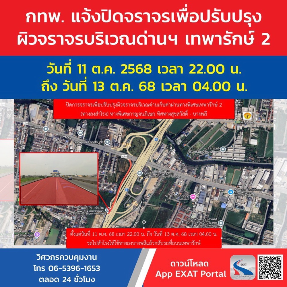 การทางพิเศษแห่งประเทศไทย (กทพ.) กระทรวงคมนาคม ได้ว่าจ้าง บริษัท ซีโก้ทรานสปอร์ต จำกัด เพื่อดำเนินงานปรับปรุงผิวจราจรถนนบริการ ในเขตทางพิเศษกาญจนาภิเษก (บางพลี-สุขสวัสดิ์) โดยบริษัทฯ จะเข้าดำเนินงานปรับปรุงผิวจราจรดังกล่าว จึงมีความจำเป็นจะต้องปิดการจราจรบริเวณด่านเก็บค่าผ่านทางพิเศษเทพารักษ์ 2 (ทางลงสำโรง) ทางพิเศษกาญจนาภิเษก (ทิศทางสุขสวัสดิ์ – บางพลี) ตั้งแต่วันที่ 11 ตุลาคม 2568 เวลา 22.00 น. ถึงวันที่ 13 ตุลาคม 2568 เวลา 04.00 น. โดยรถที่ต้องการไปสำโรง ให้ใช้ทางลงบางพลีแล้วกลับรถที่ถนนเทพารักษ์
