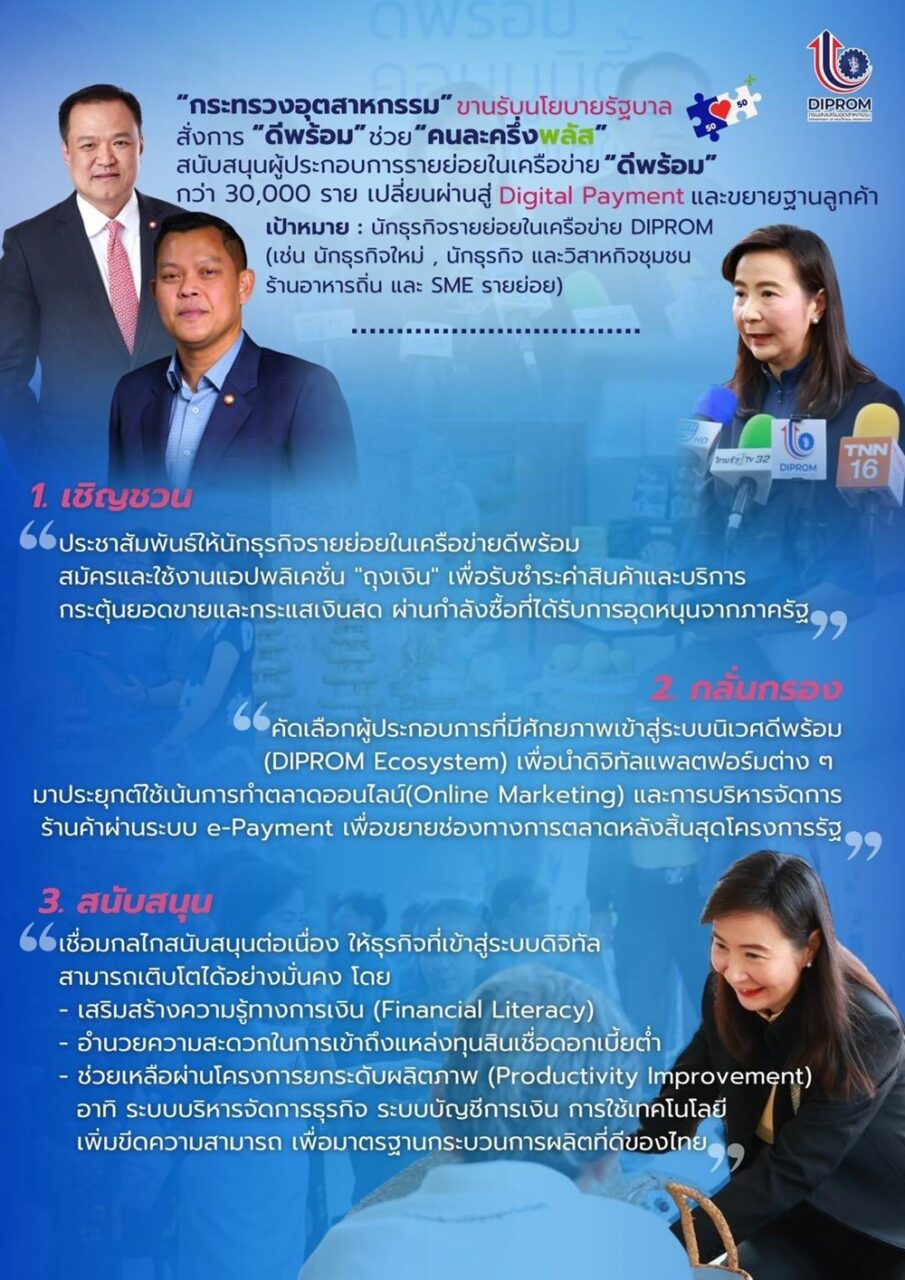 “ธนกร” สั่ง “ดีพร้อม” หนุนคนละครึ่งพลัส ตามนโยบายของนายกฯ เร่งผลักดันผู้ประกอบการรายย่อยเปลี่ยนผ่านสู่ Digital Payment และขยายฐานลูกค้า ผ่าน 3 ยุทธศาสตร์ “เชิญชวน-กลั่นกรอง-สนับสนุน”