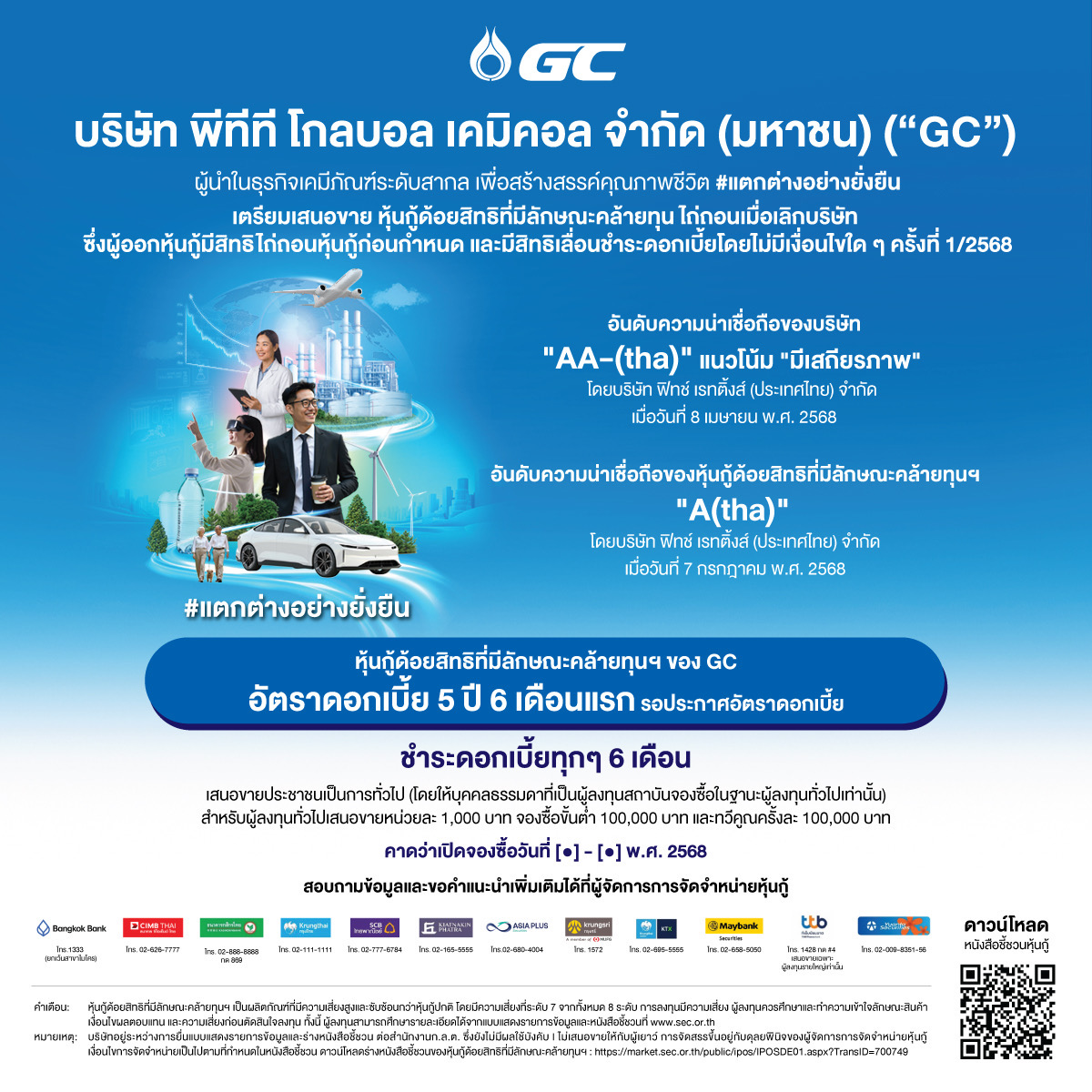 GC เตรียมออกหุ้นกู้ด้อยสิทธิที่มีลักษณะคล้ายทุนฯ สกุลเงินบาท ชุดใหม่ รับกระแสเชิงบวกจากนักลงทุน หนุนแผนบริหารเงินทุนระยะยาว รองรับการเติบโตธุรกิจมูลค่าสูง–คาร์บอนต่ำ