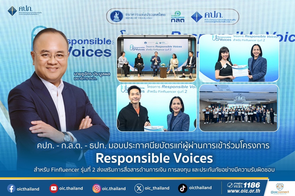 โดยในช่วงของพิธีมอบประกาศนียบัตรแก่ผู้ผ่านการอบรมโครงการ “Responsible Voices สำหรับ Finfluencer รุ่นที่ 2” ได้รับเกียรติจากศาสตราจารย์ ดร.พรอนงค์ บุษราตระกูล เลขาธิการ ก.ล.ต. เป็นประธานมอบประกาศนียบัตรและกล่าวแสดง ความยินดีแก่ Finfluencer รุ่นที่ 2 ที่ผ่านการอบรมจำนวน 38 ราย จาก 32 ช่อง พร้อมเน้นย้ำถึงความสำคัญของการสื่อสารด้านการเงิน การลงทุน และประกันภัยอย่างมีความรับผิดชอบในยุคดิจิทัล โดยมุ่งเน้นการเสริมสร้างความรู้ ความเข้าใจเกี่ยวกับ แนวทางการเผยแพร่ข้อมูลต่อผู้ติดตามอย่างถูกต้อง เหมาะสม และตระหนักถึงบทบาทของตนในฐานะผู้สร้างสรรค์คอนเทนต์ ทางการเงินที่มีจริยธรรม ผ่านรูปแบบการบรรยายและกิจกรรม Workshop จากผู้เชี่ยวชาญของทั้งสามหน่วยงานกำกับดูแล สะท้อนให้เห็นถึงพลังของผู้สร้างคอนเทนต์รุ่นใหม่ ในการใช้สื่อดิจิทัลเผยแพร่ข้อมูลด้านการเงิน การลงทุน และประกันภัยอย่าง มีความรับผิดชอบ อันสอดคล้องกับพันธกิจของสำนักงาน คปภ. ในการคุ้มครองผู้ทำประกันภัย และส่งเสริมความรู้ความเข้าใจ ด้านประกันภัยอย่างยั่งยืน