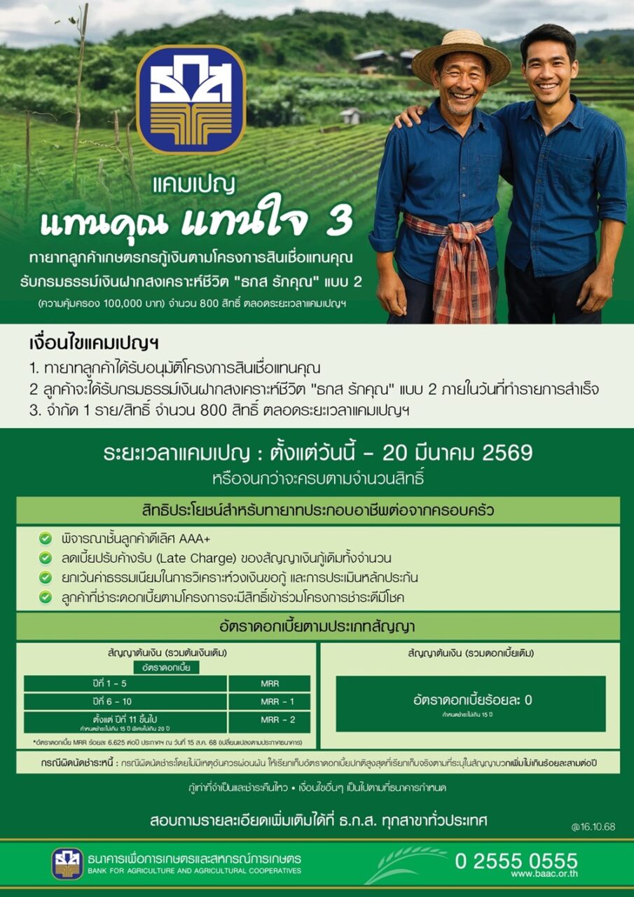 ธนาคารเพื่อการเกษตรและสหกรณ์การเกษตร (ธ.ก.ส.) จัดแคมเปญแทนคุณ แทนใจ 3 สำหรับลูกค้าที่ใช้บริการสินเชื่อแทนคุณ ที่เปิดโอกาสให้ทายาทเข้ามามีส่วนร่วมในการแก้ไขหนี้สินครัวเรือนให้กับเกษตรกรลูกค้าที่อายุตั้งแต่ 60 ปีขึ้นไป ที่พร้อมโอนทรัพย์สินหลักประกันให้กับทายาท เพื่อรักษาทรัพย์สินให้คงอยู่กับครอบครัว โดย ธ.ก.ส. จะจ่ายสินเชื่อให้ทายาทที่มารับช่วงในการประกอบอาชีพในอัตราพิเศษ พร้อมมอบสิทธิพิเศษเมื่อสินเชื่อได้รับการอนุมัติ รับทันที ความคุ้มครองชีวิตผ่านกรมธรรม์เงินฝากสงเคราะห์ชีวิต ธกส รักคุณ แบบ 2 (มูลค่า 399 บาท) พร้อมให้ความคุ้มครองสูงสุด 100,000 บาท เพียงสแกน QR Code ลงทะเบียนรับสิทธิ์ ณ สาขาที่ขอสินเชื่อ (จำกัด 800 สิทธิ์ ตลอดระยะแคมเปญ) ลงทะเบียนได้เลยตั้งแต่บัดนี้จนถึง 20 มีนาคม 2569