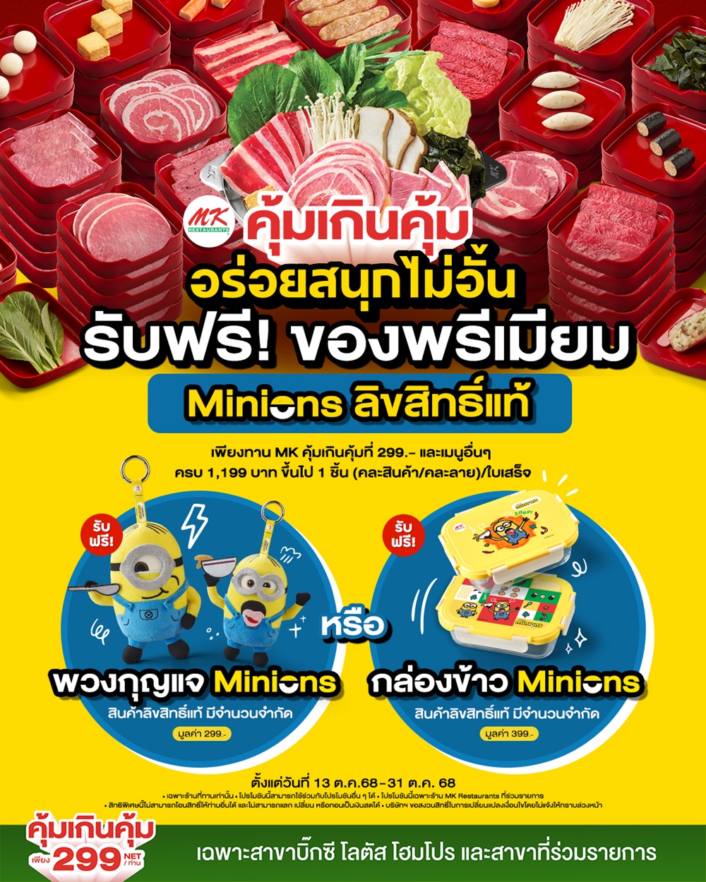 มินเนี่ยนตัวเหลืองสุดป่วน ยกขบวนมาสร้างสีสัน กับครั้งแรกของ MK บุฟเฟต์ คุ้มเกินคุ้ม 299 ที่พาคาแรคเตอร์ดังระดับโลกมาสร้างความสนุกให้เต็มอิ่ม! น้อง ๆ หนู ๆ ห้ามพลาดช่วงปิดเทอมนี้ ได้ทั้งอิ่มไม่อั้น พร้อมรับของพรีเมียม มินเนี่ยนลิขสิทธิ์แท้กลับบ้านแบบฟิน ๆ เลือกได้ทั้ง ตุ๊กตาพวงกุญแจ Minions (มูลค่า 299 บาท) หรือ กล่องข้าว Minions (มูลค่า 399 บาท) เพียงทาน MK คุ้มเกินคุ้ม 299 และเมนูอื่น ๆ ครบ 1,199 บาทขึ้นไป / ใบเสร็จ เลือกรับของพรีเมียมได้เลย 1 ชิ้น (คละสินค้า/คละลาย)/ ใบเสร็จ ตั้งแต่วันที่ 13 ตุลาคม 2568 – 31 ตุลาคม 2568 (หรือจนกว่าของจะหมด)