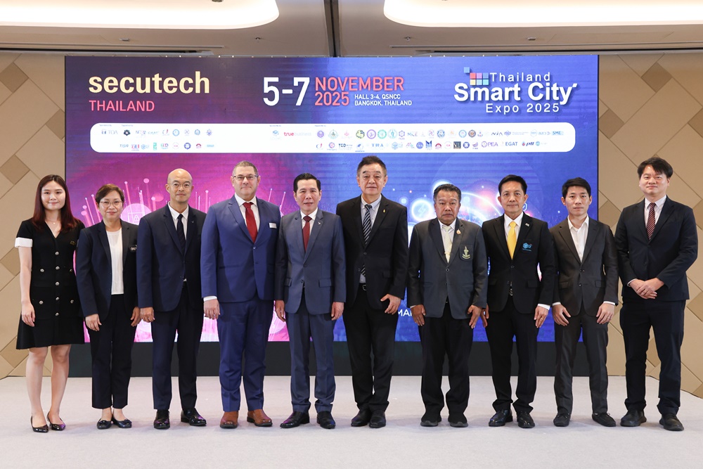 นายศักดิ์ชัย ภัทรปรีชากุล (คนที่ 5 จากขวา) กรรมการบริหาร บริษัท เอ็น.ซี.ซี. แมนเนจเม้นท์ แอนด์ ดิเวลลอปเม้นท์ จำกัด พร้อมด้วย ผศ.ดร.ณัฐพล นิมมานพัชรินทร์ (คนที่ 5 จากซ้าย) ผู้อำนวยการใหญ่ สำนักงานส่งเสริมเศรษฐกิจดิจิทัล หรือ ดีป้า และมร.อิสราเอล โกโกล (คนที่ 4 จากซ้าย) ผู้จัดการกลุ่ม บริษัท เมสเซ่ แฟรงค์เฟิร์ต (ฮ่องกง) จำกัด สาขาไต้หวัน ร่วมแถลงข่าวความพร้อมการจัดงาน ‘Thailand Smart City Expo 2025’ มหกรรมแสดงเทคโนโลยีและนวัตกรรมดิจิทัลเพื่อการพัฒนาเมืองอัจฉริยะ ที่มาพร้อมแนวคิด Activating Smart Cities, Elevating Smart Living: การพัฒนาเมืองอัจฉริยะ เพื่อยกระดับคุณภาพชีวิตของประชาชนอย่างยั่งยืน และงาน ‘Secutech Thailand 2025’ งานแสดงเทคโนโลยีระบบความปลอดภัยและการป้องกันอัคคีภัย ซึ่งทั้งสองงานจะมีขึ้นระหว่างวันที่ 5 – 7 พฤศจิกายนนี้ ที่ศูนย์การประชุมแห่งชาติสิริกิติ์