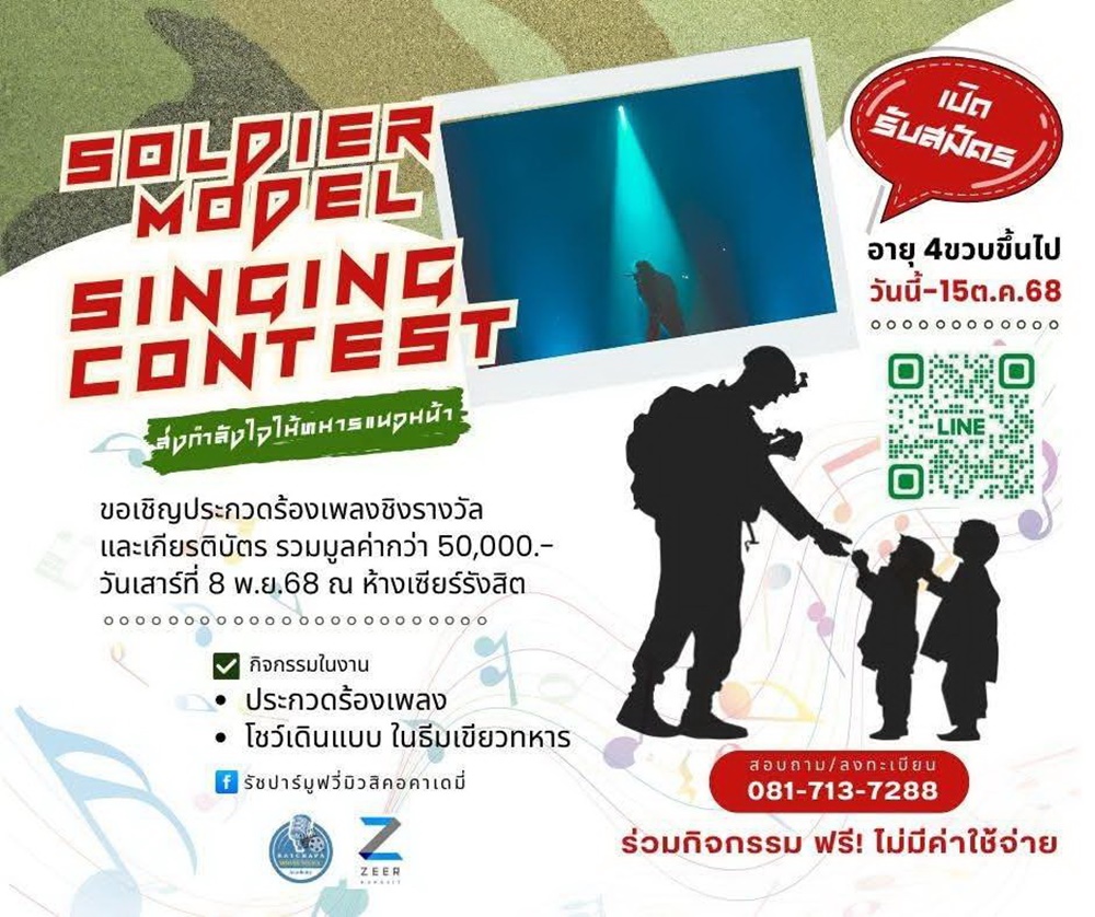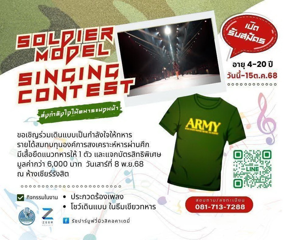 สมัครฟรีไม่มีค่าใช้จ่ายSoldier model singing contestจัด ณ ห้างเซียร์รังสิตชั้น 2 ในวันเสาร์ที่ 8 พ.ย.2568