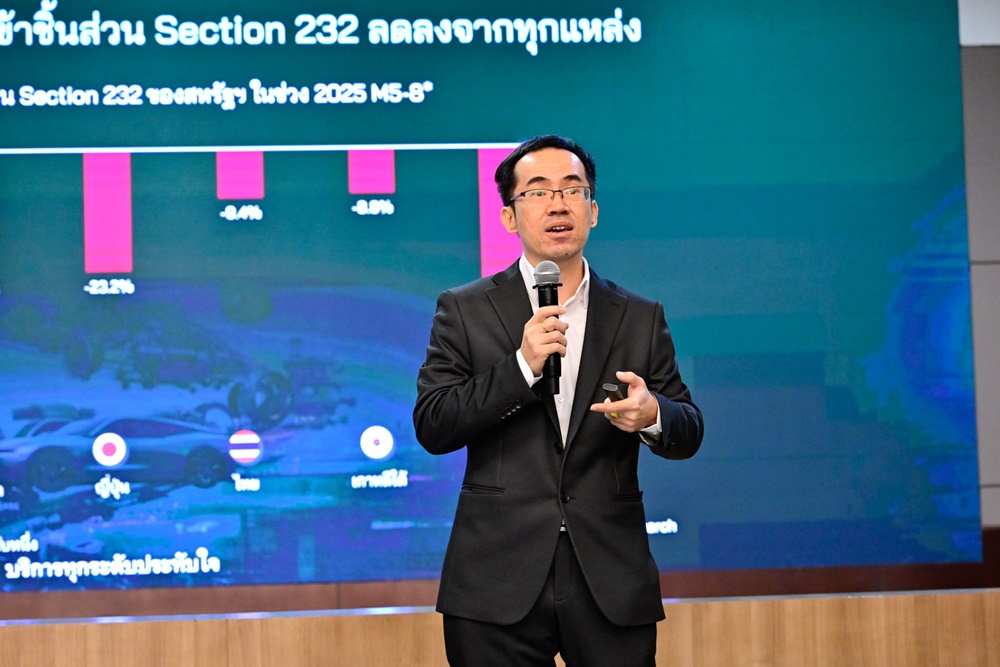 ดร. รุจิพันธ์ อัสสะรัตน์ ผู้ช่วยกรรมการผู้จัดการ บริษัท ศูนย์วิจัยกสิกรไทย จำกัด เผยว่า แม้ไทยมีสัดส่วนส่งออกรถยนต์ไปสหรัฐฯ น้อย แต่มาตรการภาษีนำเข้า Section 232 มีแนวโน้มส่งผลกระทบทางอ้อมต่อส่งออกรถยนต์ไทยไปตลาดโลก เพราะผู้ผลิตรายใหญ่ เช่น ญี่ปุ่นและเกาหลีใต้ อาจกระจายส่งออกไปตลาดอื่นมากขึ้น เพื่อลดการพึ่งพาสหรัฐฯ ซึ่งจะเพิ่มความรุนแรงของการแข่งขันในตลาดโลก ขณะเดียวกัน มาตรการนี้กระทบโดยตรงต่อการส่งออกชิ้นส่วนไทยไปสหรัฐฯ โดยมีสัดส่วนราว 26% ของมูลค่าส่งออกชิ้นส่วนไทย อย่างไรก็ดี ยางล้อขนาดเล็กของไทยยังได้เปรียบในด้านต้นทุนและคุณภาพ นอกจากนี้ ไทยยังได้รับการยกเว้นภาษี Section 232 ตามมาตรการ Import Adjustment Offset ราว 12% ของมูลค่าส่งออกชิ้นส่วน (ไม่รวมยางล้อ) ไปสหรัฐฯ มากกว่าญี่ปุ่นที่อยู่เพียง 3%