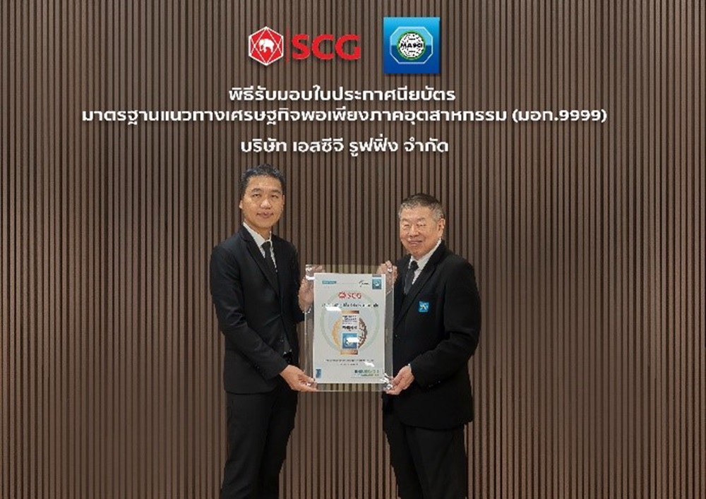 เอสซีจี รูฟฟิ่ง จำกัด ในกลุ่มธุรกิจ เอสซีจี สมาร์ท ลีฟวิง (SCG Smart Living) นำโดยคุณกฤษณ์ จินดาวานิชสกุล Chief Operation Officer – Housing Product Solution Business รับมอบประกาศนียบัตรมาตรฐานแนวทางเศรษฐกิจพอเพียงภาคอุตสาหกรรม มอก. 9999 (TIS 9999) จากคุณจงรักษ์ โรจน์พลาเสถียร ผู้อำนวยการสถาบันรับรองมาตรฐานไอเอสโอ (MASCI)