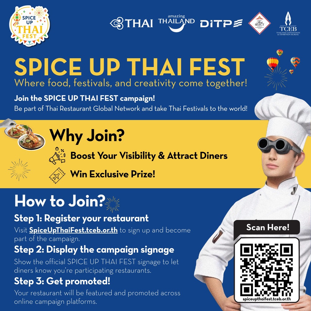 สำหรับแคมเปญ Spice Up Thai Fest ลูกค้าเพียงรับประทานอาหารที่ร้านอาหารไทยในต่างประเทศที่เข้าร่วมโครงการ พร้อมสแกน QR Code ณ ร้านอาหารที่เข้าร่วม เพื่อเข้าสู่แพลตฟอร์มออนไลน์ www.SpiceUpThaiFest.tceb.or.th และร่วมกิจกรรมโดยถ่ายภาพพร้อมบรรยายความรู้สึกกับอาหารไทยและอัตลักษณ์ความเป็นไทย และเช็คอินบนแพลตฟอร์ม ก็มีโอกาสได้รับตั๋วเครื่องบินไป-กลับจากสายการบินไทย รวมกว่า 55 รางวัล เพื่อมาร่วมสัมผัสประสบการณ์งานเฟสติวัลไทยในประเทศไทย โดยสามารถร่วมกิจกรรมได้ตั้งแต่วันที่ 15 พฤศจิกายน 2568 – 18 มกราคม 2569 พร้อมประกาศผู้ได้รับรางวัลบนแพลตฟอร์มในวันที่ 22 มกราคม 2569 สามารถติดตามรายละเอียดแคมเปญได้ที่ www.SpiceUpThaiFest.tceb.or.th