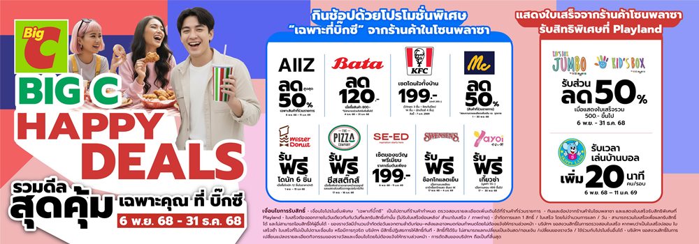 บิ๊กซี ชวนลูกค้าฉลองเทศกาลแห่งความสุขช่วงปลายปี ด้วยความสุขและความคุ้มค่า ผ่านแคมเปญ “Happy Deals รวมดีลความคุ้มส่งท้ายปีเพื่อคุณ เฉพาะที่บิ๊กซี” ที่ยกทัพโปรโมชั่นสุดพิเศษจากร้านค้าชั้นนำในโซนพลาซาและศูนย์อาหารทั่วประเทศ เพื่อให้ลูกค้าได้เพลิดเพลินกับประสบการณ์การ กิน เที่ยว ช้อป ครบจบในที่เดียว