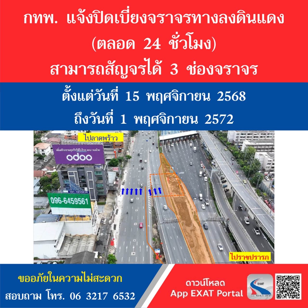 กทพ. ต้องขออภัยในความไม่สะดวกมา ณ โอกาสนี้ และขอความร่วมมือผู้ที่ใช้เส้นทางบริเวณดังกล่าว โปรดสังเกตป้ายเตือนสัญญาณจราจรต่าง ๆ และปฏิบัติตามเครื่องหมายจราจรอย่างเคร่งครัด เพื่อความปลอดภัยของผู้ใช้ทาง หากมีข้อร้องเรียนหรือข้อเสนอแนะที่เป็นประโยชน์ สามารถแจ้งได้ที่ 063-217-6532