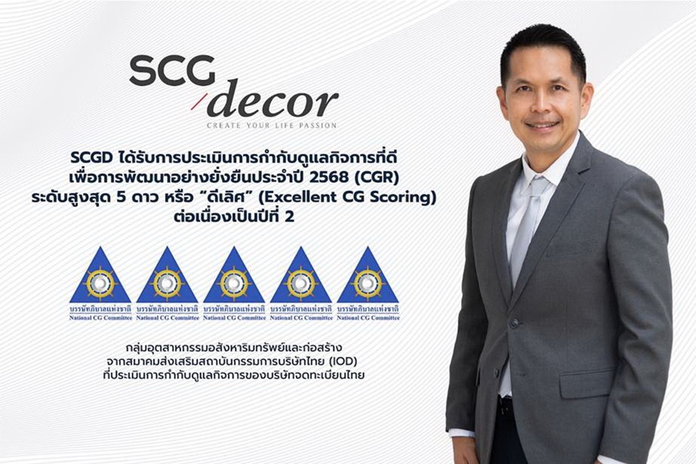 SCG Decor หรือ SCGD ได้รับการประเมินการกำกับดูแลกิจการที่ดี เพื่อการพัฒนาอย่างยั่งยืนประจำปี 2568 (CGR) ระดับสูงสุด 5 ดาว หรือ “ดีเลิศ” (Excellent CG Scoring) กลุ่มอุตสาหกรรมอสังหาริมทรัพย์และก่อสร้าง ต่อเนื่องเป็นปีที่ 2 จากสมาคมส่งเสริมสถาบันกรรมการบริษัทไทย (IOD) ที่ประเมินการกำกับดูแลกิจการของบริษัทจดทะเบียนไทย ประจำปี 2568 ตอกย้ำความมุ่งมั่นในการดำเนินธุรกิจด้วยความโปร่งใส เป็นธรรม รับผิดชอบต่อสังคม เพื่อขับเคลื่อนการเติบโตอย่างยั่งยืน