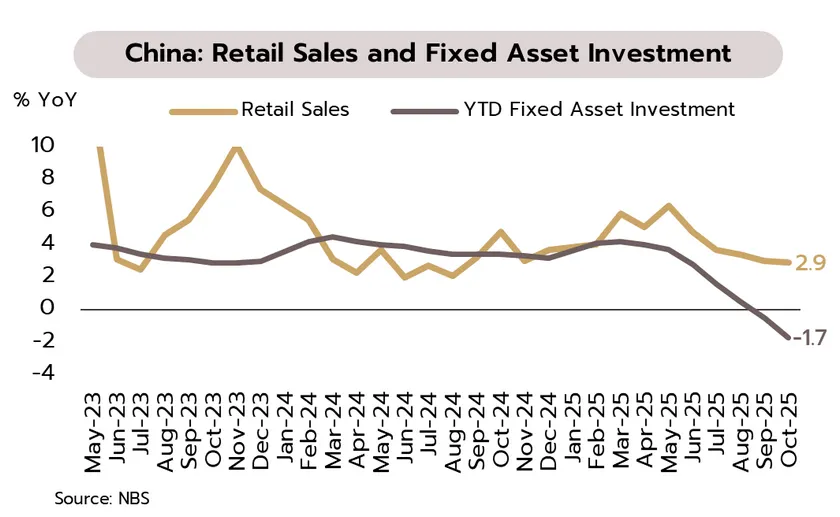 ปัจจัยขับเคลื่อนเศรษฐกิจสำคัญของจีนอ่อนแรงลง โดยการเติบโตของยอดค้าปลีกสินค้าชะลอลงติดต่อกันเป็นเดือนที่ 5 เหลือเพียง 2.9 % YoY ในเดือนตุลาคม ผลผลิตภาคอุตสาหกรรมขยายตัวต่ำสุดในรอบ 1 ปีที่ 4.9% และการลงทุนในสินทรัพย์ถาวรหดตัวเร่งขึ้นจาก -0.5% ในช่วง 9 เดือนแรกเป็น -1.7% ในช่วง 10 เดือนแรก ขณะที่ราคาบ้านใหม่และบ้านมือสองในเดือนตุลาคมยังหดตัวต่อเนื่องที่ -2.6% และ -5.4% ตามลำดับ ส่วนยอดสินเชื่อใหม่ภาคครัวเรือนพลิกกลับมาลดลงอีกครั้งที่ -360.4 พันล้านหยวนในเดือนตุลาคมจากที่เคยเพิ่มขึ้น 389 พันล้านหยวนในเดือนกันยายน