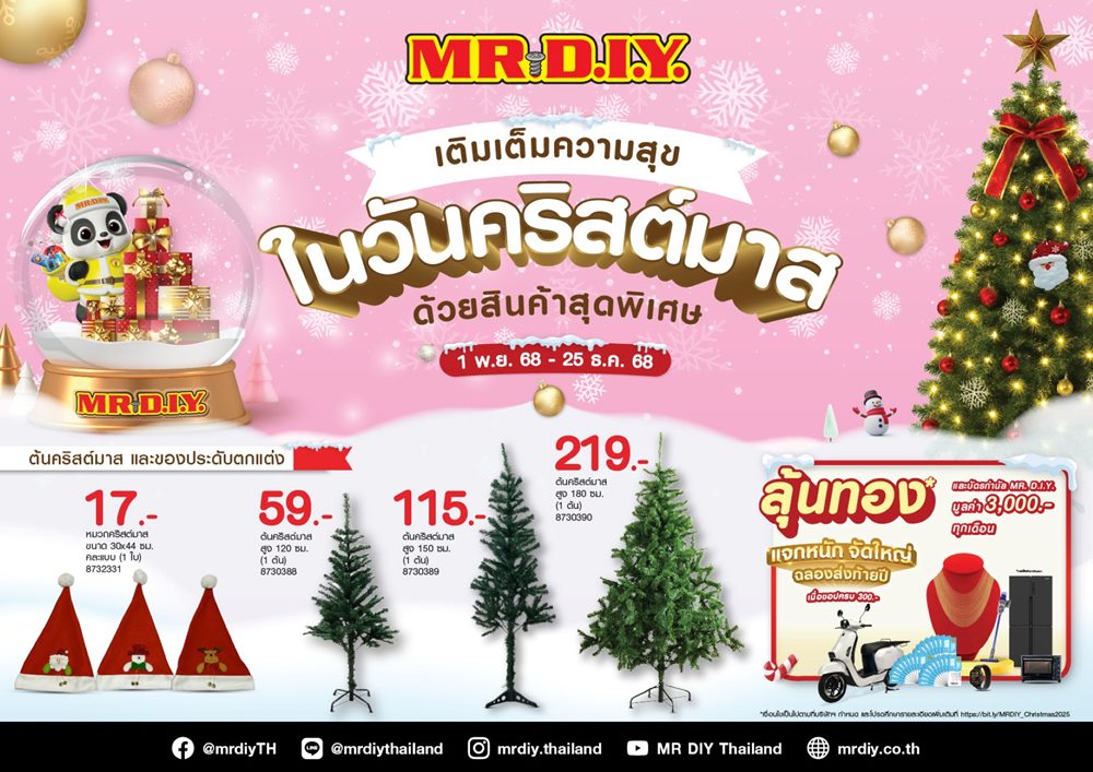 มิสเตอร์. ดี.ไอ.วาย. ผู้นำธุรกิจค้าปลีกอุปกรณ์ตกแต่งบ้านและสินค้าไลฟ์สไตล์ชวนลูกค้าชอปเพลิน “เติมเต็มความสุขในวันคริสต์มาส”(1) ต้อนรับเทศกาลสุดอบอุ่นส่งท้ายปี ด้วยสินค้าคริสต์มาสรวม 210 รายการ ในราคาถูกคุ้มเสมอ (Always Low Prices) ณ ร้านมิสเตอร์. ดี.ไอ.วาย. สาขาที่ร่วมรายการ(2) ตั้งแต่วันที่ 1 พฤศจิกายน 2568 – 25 ธันวาคม 2568