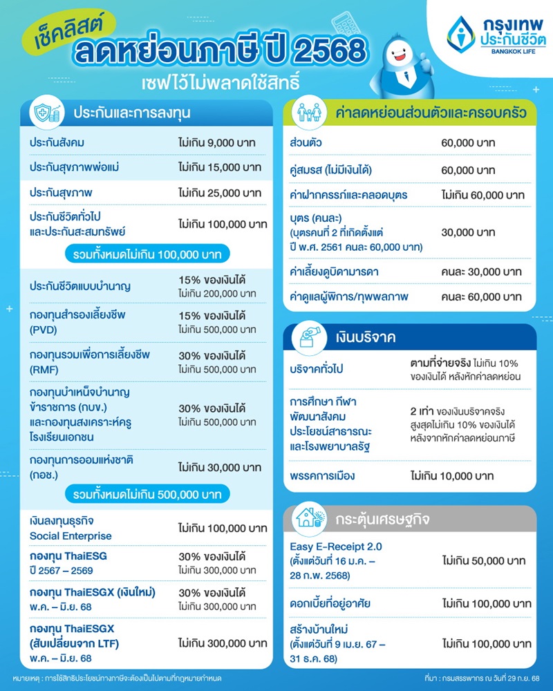 - โครงการ Easy E-Receipt 2.0 (ตั้งแต่วันที่ 16 มกราคม – 28 กุมภาพันธ์ 2568) ลดหย่อนภาษีได้สูงสุด 50,000 บาท จากการซื้อสินค้าหรือค่าบริการ ที่มี e-Tax Invoice หรือ e-Receipt