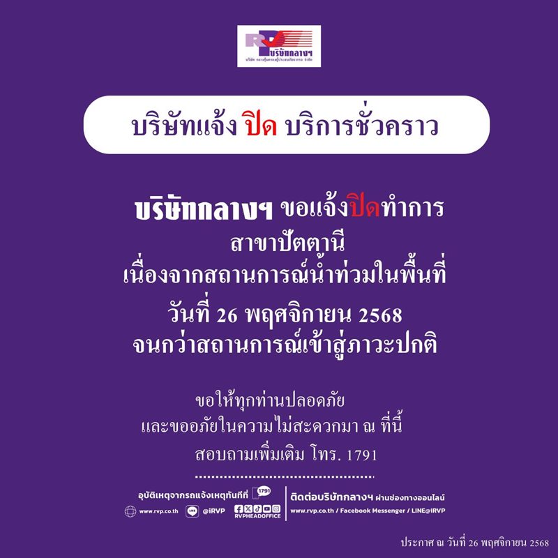 เนื่องจากเกิดสถานการณ์น้ำท่วมในเขตจังหวัดปัตตานี ทำให้มีปริมาณน้ำท่วมสูงบริเวณโดยรอบบริษัทกลางฯ รถไม่สามารถสัญจรไปมาได้ จนไม่สามารถเปิดให้บริการได้ ทางบริษัทจึงประกาศปิดให้บริการบริษัทกลางฯ สาขาปัตตานี ชั่วคราว ในวันที่ 26 พฤศจิกายน 2568