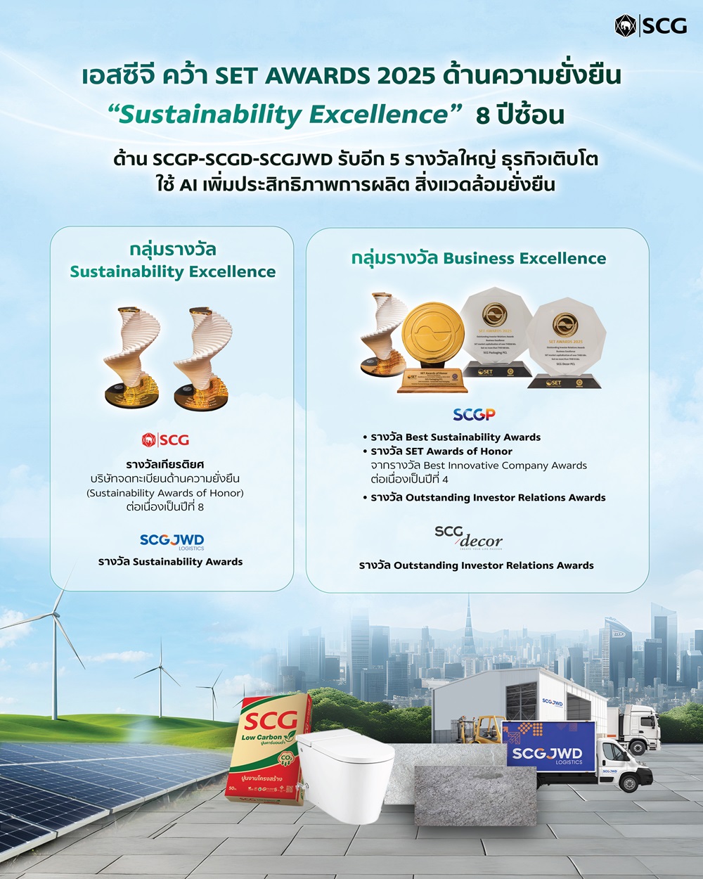 เอสซีจี คว้า SET AWARDS 2025 ด้านความยั่งยืน “Sustainability Excellence” 8 ปีซ้อน ด้าน SCGP-SCGD-SCGJWD รับอีก 5 รางวัลใหญ่ ธุรกิจเติบโต ใช้ AI เพิ่มประสิทธิภาพการผลิต สิ่งแวดล้อมยั่งยืน