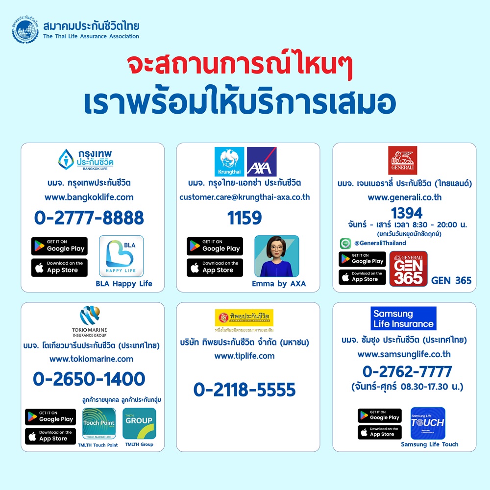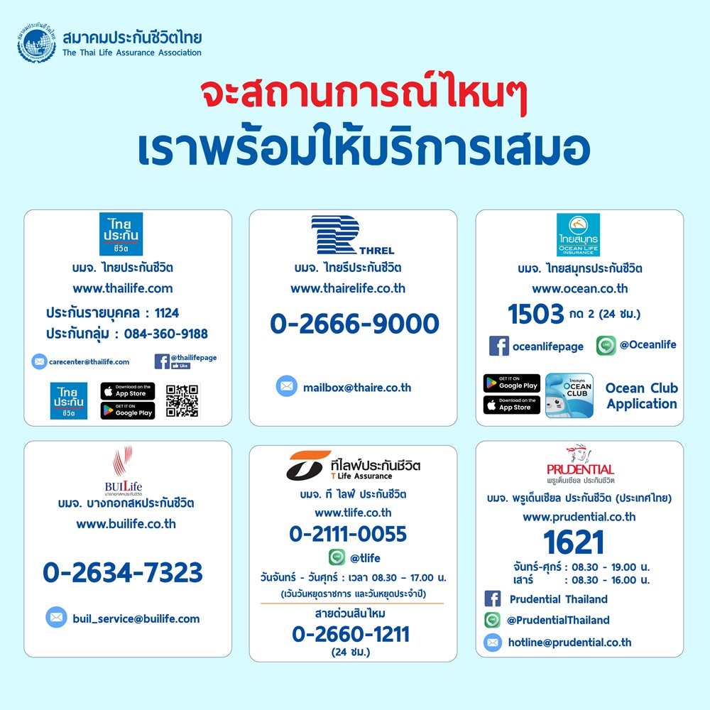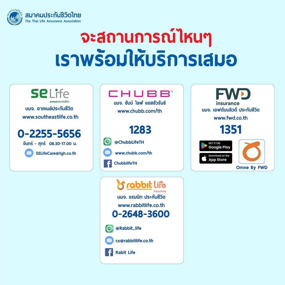 หากต้องการสอบถามข้อมูล หรือขอคำแนะนำเกี่ยวกับกรมธรรม์หรือความคุ้มครอง สามารถติดต่อสอบถามได้ที่สมาคมประกันชีวิตไทย ผ่านช่องทาง Facebook : สมาคมประกันชีวิตไทย และทางโทรศัพท์ 02-679-8080 หรืออีเมล tlaa@tlaa.org