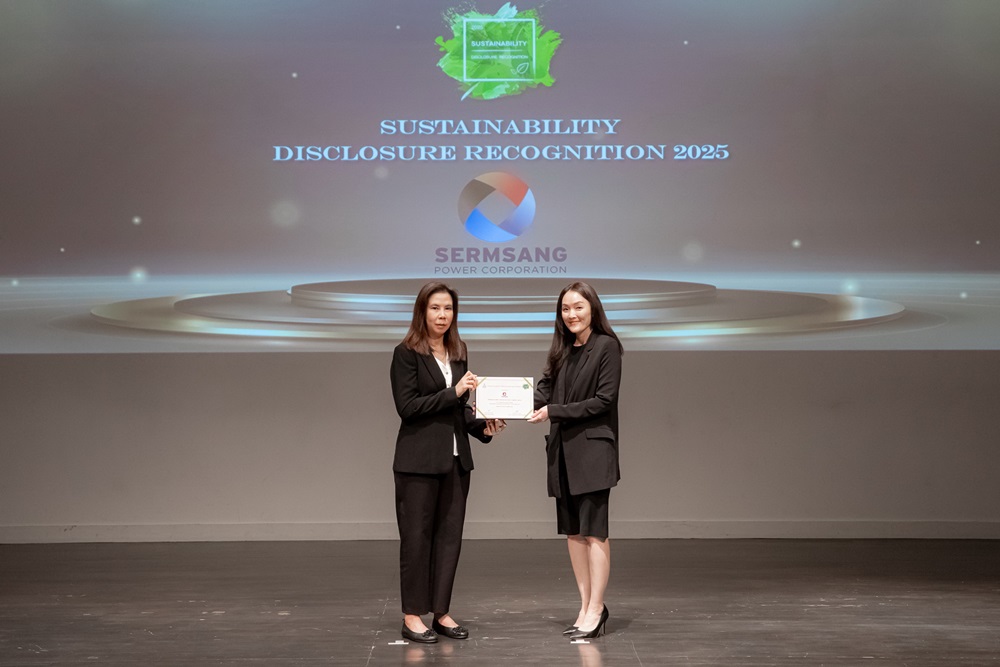 นางสาวลินดา เอนกรัชดาพร (ขวา) ผู้อำนวยการฝ่ายกลยุทธ์และนักลงทุนสัมพันธ์ บริษัท เสริมสร้าง พาวเวอร์ คอร์ปอเรชั่น จำกัด (มหาชน) (SSP) เป็นตัวแทนบริษัทฯ เข้ารับรางวัล (ประกาศเกียรติคุณ) “Sustainability Disclosure Recognition 2025” จาก นางสาววีรญา ปรียาพันธ์ (ซ้าย) ผู้อำนวยการ ประชาคมการเปิดเผยข้อมูลความยั่งยืน ในพิธีมอบรางวัลการเปิดเผยข้อมูลความยั่งยืนประจำปี 2568 ต่อเนื่องเป็นปีที่ 2 ตอกย้ำผู้นำด้านความยั่งยืน รางวัลดังกล่าวจะมอบให้แก่บริษัทที่มีความสม่ำเสมอ ในการให้ความสำคัญกับการเผยแพร่ข้อมูลการดำเนินงานด้านความยั่งยืนผ่าน Sustainability Report ที่ครอบคลุมทั้งด้านสิ่งแวดล้อม สังคม และเศรษฐกิจ (ESG:Environmental, Social and Governance) ซึ่งสะท้อนให้เห็นถึงความมุ่งมั่นของ SSP ในการดำเนินธุรกิจผลิตไฟฟ้าด้วยพลังงานทดแทนที่คำนึงถึงทุกภาคส่วน มุ่งเน้นการพัฒนาองค์กร เพื่อสร้างความเชื่อมั่นและความมั่นคงด้านพลังงานระยะยาว งานดังกล่าวจัดขึ้น ณ หอศิลปวัฒนธรรมแห่ง
