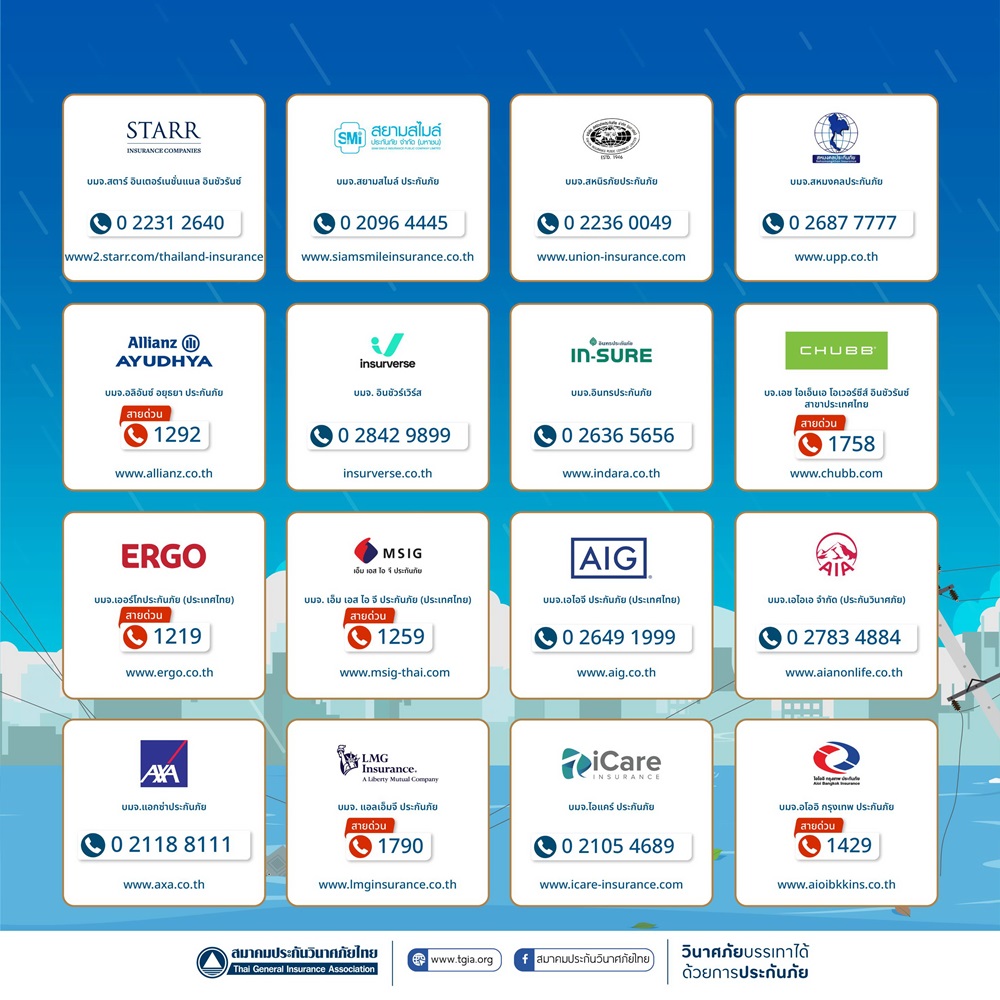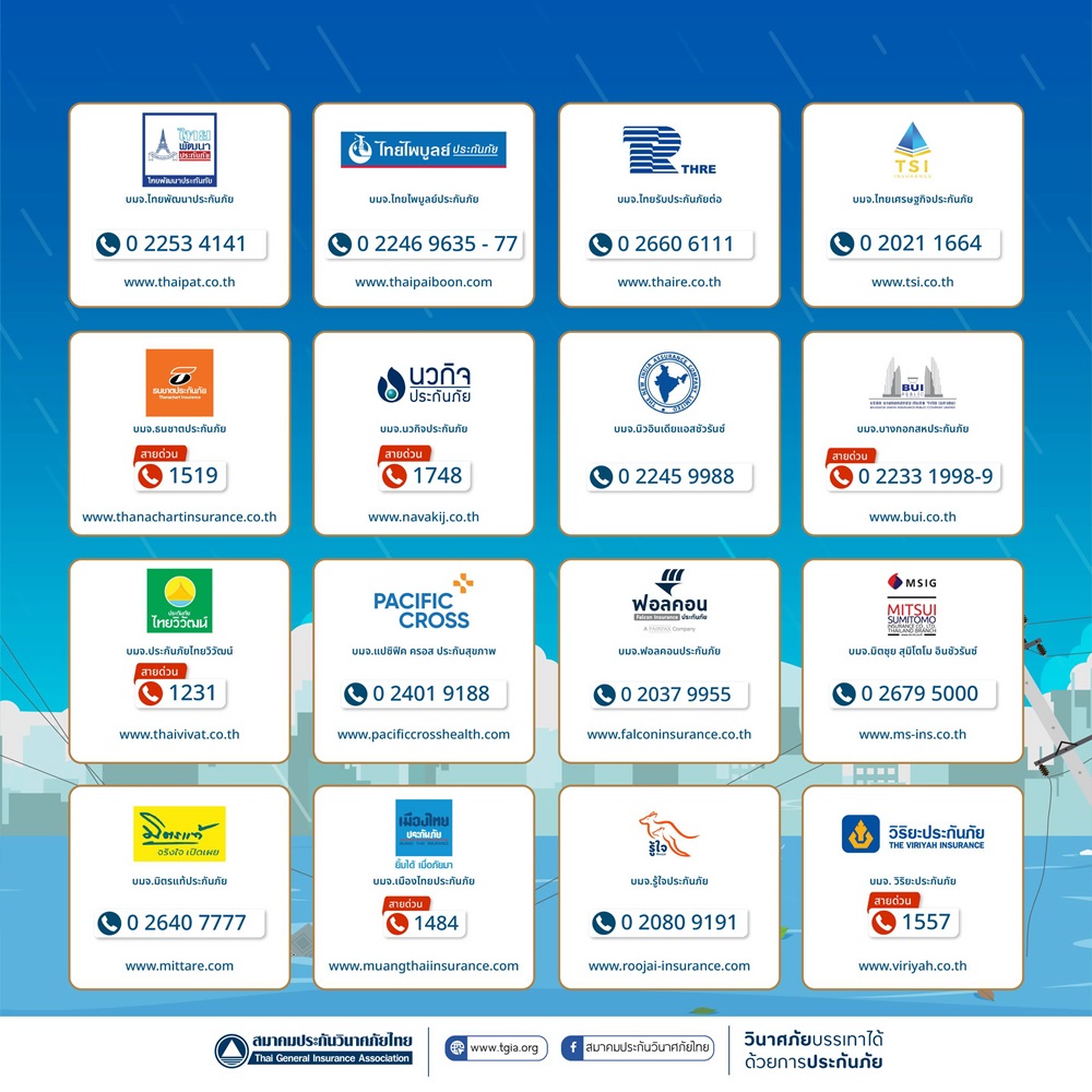 ดร. สมพร สืบถวิลกุล นายกสมาคมประกันวินาศภัยไทย กล่าวเพิ่มเติมว่า นอกจากนี้ เพื่อเป็นการดูแลและให้บริการผู้เอาประกันภัยที่ได้รับความเสียหาย สมาคมประกันวินาศภัยไทย ได้ตั้งศูนย์ประสานงานและอำนวยความสะดวกด้านประกันภัย เพื่อช่วยอำนวยความสะดวกในการเรียกร้องค่าสินไหมทดแทน การตรวจสอบข้อมูลในกรณีที่กรมธรรม์สูญหาย ตลอดจนการให้คำแนะนำเกี่ยวกับรายละเอียดความคุ้มครองผ่านช่องทางโทรศัพท์ 0 2108 8399 ในวันและเวลาทำการ และช่องทางออนไลน์ Facebook สมาคมประกันวินาศภัยไทย ตลอด 24 ชั่วโมง พร้อมทั้งเผยแพร่ประชาสัมพันธ์หมายเลขสายด่วนของทุกบริษัทประกันภัยให้ประชาชนรับทราบและติดต่อได้อย่างสะดวกรวดเร็ว รวมถึงประสานงานกับบริษัทสมาชิกให้เตรียมความพร้อมในการให้บริการช่วยเหลืออย่างเต็มที่ เร่งดำเนินการจ่ายค่าสินไหมทดแทน เพื่อบรรเทาความเดือดร้อนของผู้เอาประกันภัยโดยเร็วที่สุด