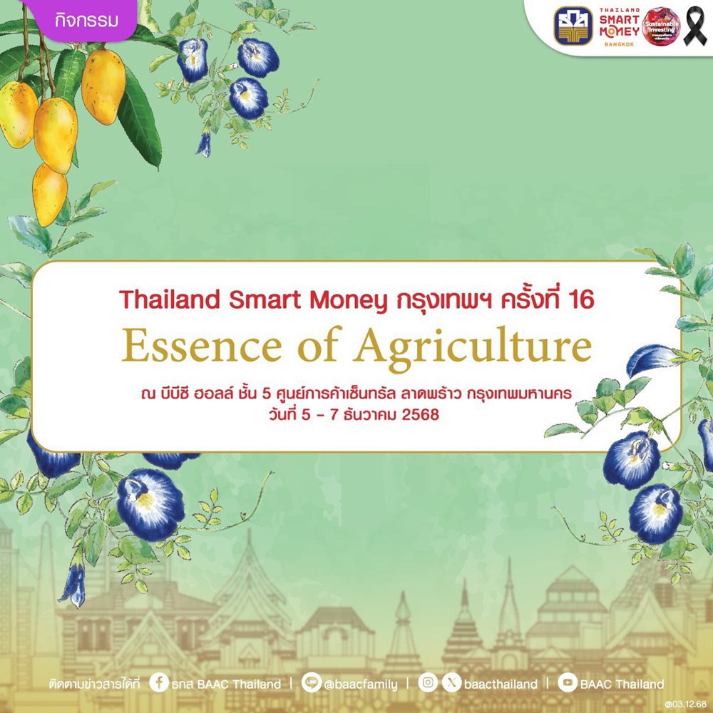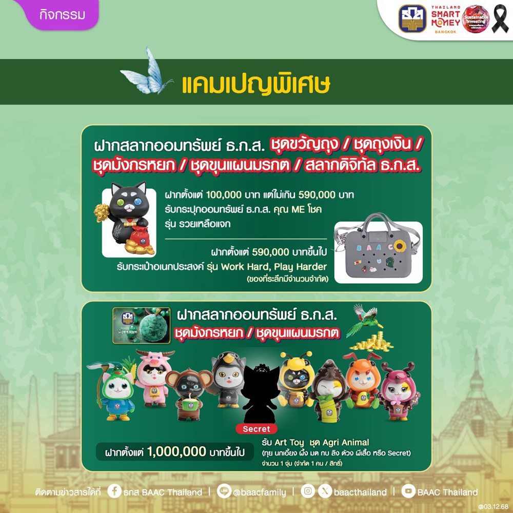 นายไพศาล หงษ์ทอง รองผู้จัดการธนาคารเพื่อการเกษตรและสหกรณ์การเกษตร (ธ.ก.ส.) เปิดเผยว่า ธ.ก.ส. เสิร์ฟโปรโมชันพิเศษพร้อมบริการการเงินแบบครบวงจรภายใต้ธีม Essence of Agriculture เข้าร่วมงาน Thailand Smart Money กรุงเทพฯ ครั้งที่ 16 อาทิ ผลิตภัณฑ์เงินฝาก –เงินฝากแก้วมรกต ฝากเริ่มต้นเพียง 2,000 บาท รับผลตอบแทนเป็นดอกเบี้ยเงินฝาก แถมสิทธิประโยชน์ความคุ้มครองอุบัติเหตุสูงสุดถึง 25 เท่าของยอดเงินฝากคงเหลือ วงเงินคุ้มครองสูงสุดไม่เกิน 10 ล้านบาท พิเศษ เมื่อฝากตั้งแต่ 6,000 บาทขึ้นไป และคงยอดไว้ 3 เดือน คู่กับฝากสลากออมทรัพย์ ธ.ก.ส. ชุดขุนแผนมรกต ตั้งแต่ 4,000 บาทขึ้นไป หรือฝากเงินฝากแก้วมรกต ตั้งแต่ 10,000 บาทขึ้นไป และคงยอดไว้ 3 เดือน รับทันที พวงกุญแจมังแมว เมื่อฝากตั้งแต่ 200,000 – 499,999 บาท รับสิทธิ์จุ่ม Art Toy มังแมว จำนวน 1 จุ่ม ฝากตั้งแต่ 500,000 – 999,999 บาท รับสิทธิ์จุ่ม Art Toy ชุด Agri Animal จำนวน 1 จุ่ม และเมื่อฝากตั้งแต่ 1,000,000 บาทขึ้นไป รับ Art Toy ชุด Agri Animal ตัว Secret จำนวน 1 ตัวหรือเมื่อฝากตั้งแต่ 20,000 บาทขึ้นไป และคงยอดไว้ 3 เดือน พร้อมสมัครบัตรเดบิตแบบมีประกัน (พลอยไพฑูรย์ หรือบุษย์น้ำทอง) รับเพิ่มสลากออมทรัพย์ ธ.ก.ส. ชุดมังกรหยก มูลค่า 100 บาท ด้านสลากออมทรัพย์ อาทิ สลากออมทรัพย์ ธ.ก.ส. ชุดขุนแผนมรกต หน่วยละ 2,000 บาท ลุ้นโชคใหญ่ทุกเดือน มูลค่า 40 ล้านบาท และรางวัลอื่น ๆ รวมมูลค่ากว่า 72 ล้านบาทต่อเดือน ถึง 24 ครั้ง เมื่อฝากครบ 2 ปี ได้รับดอกเบี้ยทันทีหน่วยละ 19 บาท หรือคิดเป็น 0.475% และฝาก 1,000 หน่วยขึ้นไป การันตีถูกรางวัลทุกงวด สลากออมทรัพย์ ธ.ก.ส. ชุดมังกรหยก หน่วยละ 100 บาทที่ให้ทั้งผลตอบแทนและสิทธิ์ลุ้นรางวัลใหญ่ทุกเดือนเมื่อฝากสลากออมทรัพย์ ธ.ก.ส. ชุดขุนแผนมรกตหรือชุดมังกรหยก ตั้งแต่ 1,000,000 บาทขึ้นไป รับสิทธิ์จุ่ม Art Toy ชุด AGRI ANIMAL (ทุย นกเอี้ยง ผึ้ง มด กบ ลิง ด้วงกว่าง ผีเสื้อและ ตัว Secret) จำนวน 1 จุ่ม (จำกัด 1 คน/สิทธิ์) ซึ่งเปิดตัว Art toy ตัว Secret ในงานนี้เป็นครั้งแรก หรือเมื่อฝากสลากออมทรัพย์ ธ.ก.ส. ชุดขุนแผนมรกต หน่วยละ 2,000 บาท ชุดมังกรหยก หน่วยละ 100 บาท ชุดถุงเงิน หน่วยละ100 บาท ชุดขวัญถุง หน่วยละ 20 บาท หรือสลากดิจิทัล ธ.ก.ส. หน่วยละ 50 บาท ตั้งแต่ 100,000 บาท แต่ไม่เกิน 590,000 บาท รับกระปุกออมทรัพย์ คุณ ME โชค รุ่นรวยเหลือแจก หรือเมื่อฝากตั้งแต่ 590,000 บาทขึ้นไป รับเลยกระเป๋าอเนกประสงค์ รุ่น Work Hard, Play Harder