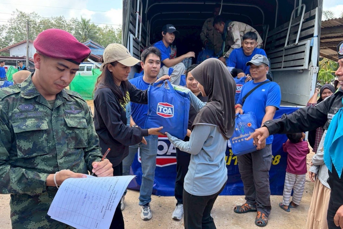 นายประจักษ์ ตั้งคารวคุณ ประธานผู้ก่อตั้ง TOA เผยว่า จากความเสียหายอย่างหนักที่เกิดจากอุทกภัยครั้งใหญ่ในภาคใต้ ซึ่งส่งผลกระทบต่อชีวิตความเป็นอยู่ของพี่น้องประชาชน และระบบสาธารณสุขโดยตรง เราจึงมีความห่วงใยและเข้าใจถึงความยากลำบากที่ทุกคนกำลังเผชิญจึงพร้อมเป็นส่วนหนึ่งในการสนับสนุน ช่วยเหลือ เยียวยา และฟื้นฟูผู้ประสบอุทกภัยอย่างต่อเนื่องหลังสถานการณ์น้ำท่วมคลี่คลายลง เดินหน้า โครงการ TOA ไม่ทิ้งกัน “รวมพลังไทย ฟื้นฟูน้ำท่วมภาคใต้” ตั้งแต่การลงพื้นที่ช่วยเหลือเยียวยาพี่น้องประชาชนชาวใต้ ในการระดมทีม ‘ทีโอเอ อาสา’ ร่วมกับกำลังทหาร (กอ.รมอ.ภาค 4 ส่วนหน้า, กองทัพภาคที่ 4, มณฑลทหารบกที่ 42) ส่งมอบถุงยังชีพกว่า 2,000 ชุด ประกอบด้วย ข้าวสาร บะหมี่กึ่งสำเร็จรูป ปลากระป๋อง ถั่วมารูโจ้ น้ำยาทำความสะอาดทีโพล์ และสเปรย์กำจัดแมลงเชนไดร้ท์ รวมทั้งสิ่งของบรรเทาทุกข์ ผ้าห่มกันหนาว เสื้อยืด น้ำดื่ม และชุดผลิตภัณฑ์ทำความสะอาดทีโพล์ แจกจ่ายให้แก่ประชาชนในพื้นที่ชุมชนต่างๆ ที่ได้รับผลกระทบอย่างทั่วถึง อาทิ ชุมชนบ้านกลางนา ชุมชนอู่ ทส. ชุมชนจันทร์วิโรจน์ ชุมชนบางแฟ้บ ชุมชนบ้านพักรถไฟ ชุมชนศิครินทร์ และชุมชนรายย่อยอื่นๆ รวมทั้งในพื้นที่จังหวัดยะลา และปัตตานี เพื่อเร่งเยียวยา ให้ความช่วยเหลือเข้าถึงทุกคนอย่างทั่วถึงและรวดเร็วที่สุด