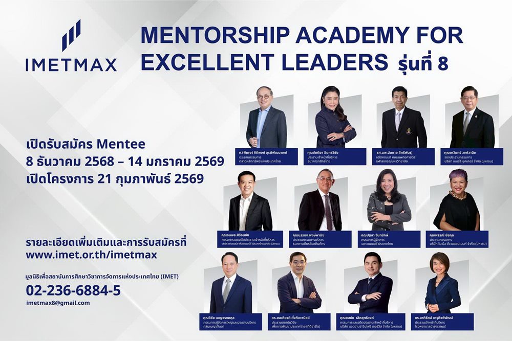 การเปิดรับสมัครเมนที (Mentee) โครงการ IMET MAX รุ่นที่ 8 เริ่มตั้งแต่วันนี้จนถึงวันที่ 14 มกราคม 2569 โดยจะคัดเลือกจากผู้นำรุ่นใหม่อายุระหว่าง 35-45 ปี ซึ่งมีความหลากหลายในกลุ่มอาชีพ ได้แก่ ผู้นำธุรกิจ ทายาทธุรกิจ ข้าราชการ ผู้บริหารบริษัทเอกชน และผู้นำองค์กรธุรกิจเพื่อสังคม โดยจะต้องมีคุณสมบัติสำคัญ 3 ประการ ได้แก่ 1. เป็นผู้นำที่มีศักยภาพสูงสามารถสร้างผลกระทบเชิงบวกให้สังคมในวงกว้าง 2. เป็นคนดีที่มีคุณธรรมและจริยธรรม และ 3. ผู้สมัครมีคำถามสำคัญในชีวิตที่ยังไม่ได้รับคำตอบ โดยเชื่อว่ากระบวนการ Mentoring สามารถช่วยค้นหาคำตอบได้ ซึ่งถือเป็นหัวใจสำคัญของการสร้าง “ผู้นำ” ที่มีทั้งความดี และความเก่ง ส่งต่อคุณค่าที่ดีสู่สังคมได้