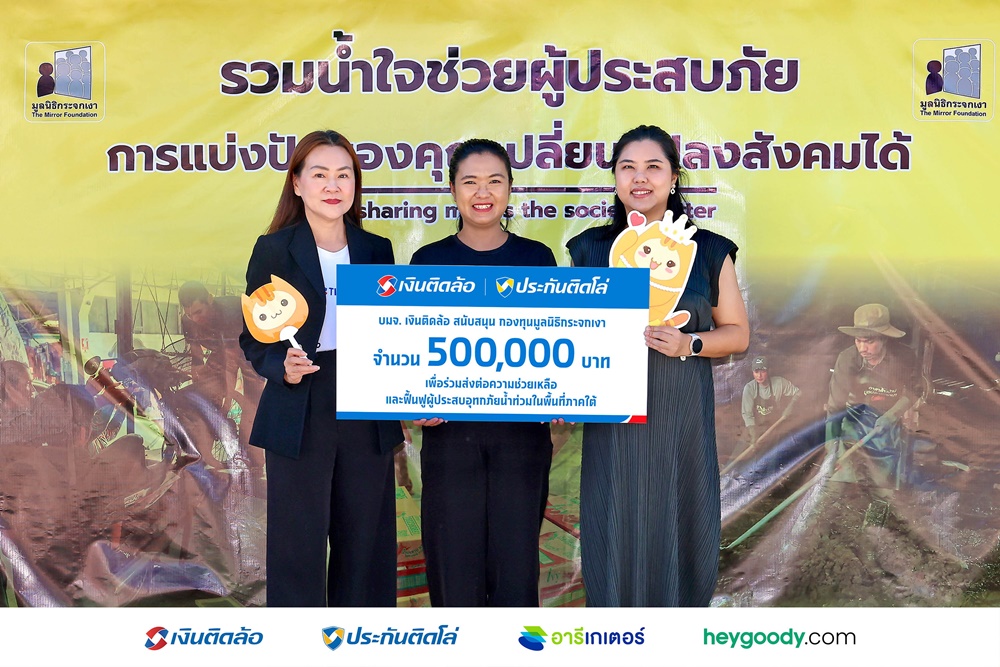 จากสถานการณ์น้ำท่วมที่ส่งผลกระทบต่อพื้นที่หลายจังหวัดในภาคใต้บริษัท เงินติดล้อ จำกัด (มหาชน) บริษัทในกลุ่ม Tidlor Holdings (TIDLOR) โดย นางสาวนิภา วนิชวัฒน์ (ซ้าย) ผู้บริหารระดับสูง สายงานกิจกรรมเพื่อสังคม เป็นตัวแทนชาวเงินติดล้อ มอบเงินจำนวน 500,000 บาท ให้กับโครงการกองทุนฉุกเฉินมูลนิธิกระจกเงา ผ่านช่องทางเทใจดอทคอม เพื่อสนับสนุนภารกิจช่วยเหลือและฟื้นฟูผู้ประสบอุทกภัยในพื้นที่ภาคใต้ ปี 2568 โดยได้รับเกียรติจาก นางสาวเอด้า จิรไพศาลกุล (ขวา) ผู้บริหารเทใจดอทคอม และ นางสาวลักขณา ศิริกาล (กลาง) หัวหน้าฝ่ายประชาสัมพันธ์ มูลนิธิกระจกเงา เป็นผู้รับมอบ ณ สำนักงานมูลนิธิกระจกเงา ถนนวิภาวดีรังสิต กรุงเทพฯ