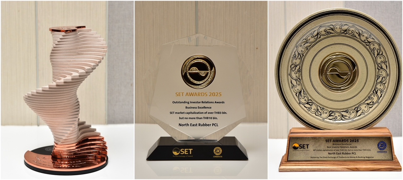 บริษัท นอร์ทอีส รับเบอร์ จำกัด (มหาชน) หรือ NER คว้า 3 รางวัลใหญ่จากเวที SET Awards 2025 ได้แก่ 1.) รางวัล Best Investor Relation Award ด้าน “การสื่อสารนักลงทุน” ดีที่สุด 2.) รางวัล Outstanding Investor Relations Awards รางวัลยกย่องบริษัทที่มี “การทำงานด้านสื่อสารนักลงทุน”ที่โดดเด่นเป็นพิเศษ และ3.) รางวัล Commended Sustainability Award รางวัลยกย่องบริษัทจดทะเบียนที่ดำเนินธุรกิจโดยคำนึงถึงความยั่งยืนในมิติ สิ่งแวดล้อม สังคม และธรรมาภิบาล (ESG) โดยNER คงมุ่งมั่นพัฒนาศักยภาพองค์กรเพื่อสร้างคุณค่าที่มากกว่ายางต่อไป…