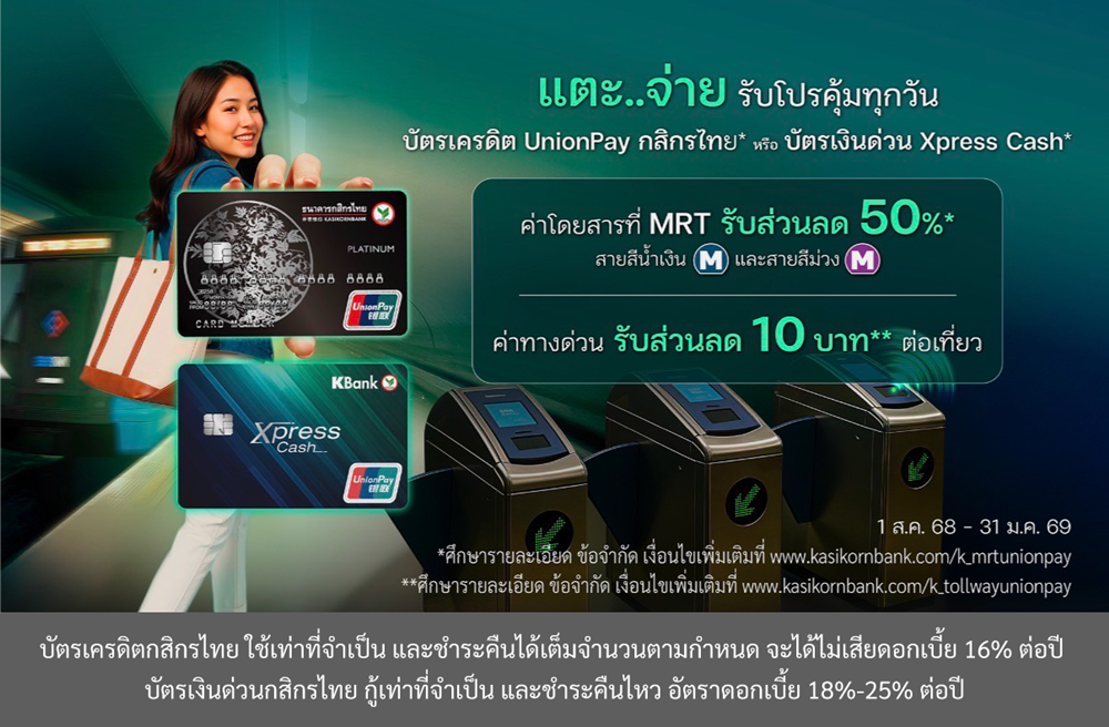 บัตรเครดิต UnionPay กสิกรไทย* และบัตรเงินด่วน Xpress Cash* ช่วยลดค่าใช้จ่ายประจำวันของคนเมืองที่เดินทางด้วยรถไฟฟ้า MRT และขึ้นทางด่วน พร้อมอำนวยความสะดวกในการเดินทางเพียงแค่แตะจ่ายผ่านบัตร รับโปรคุ้มแรงได้ทุกวัน