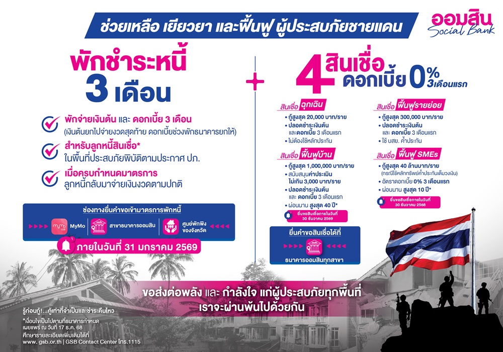 ออมสิน จัดเต็มชุดมาตรการช่วยลูกหนี้ในพื้นที่ชายแดน พักหนี้ 3 เดือน – ดอกเบี้ยยกให้สินเชื่อพิเศษ ดอกเบี้ย 0% ใน 3 เดือนแรก
