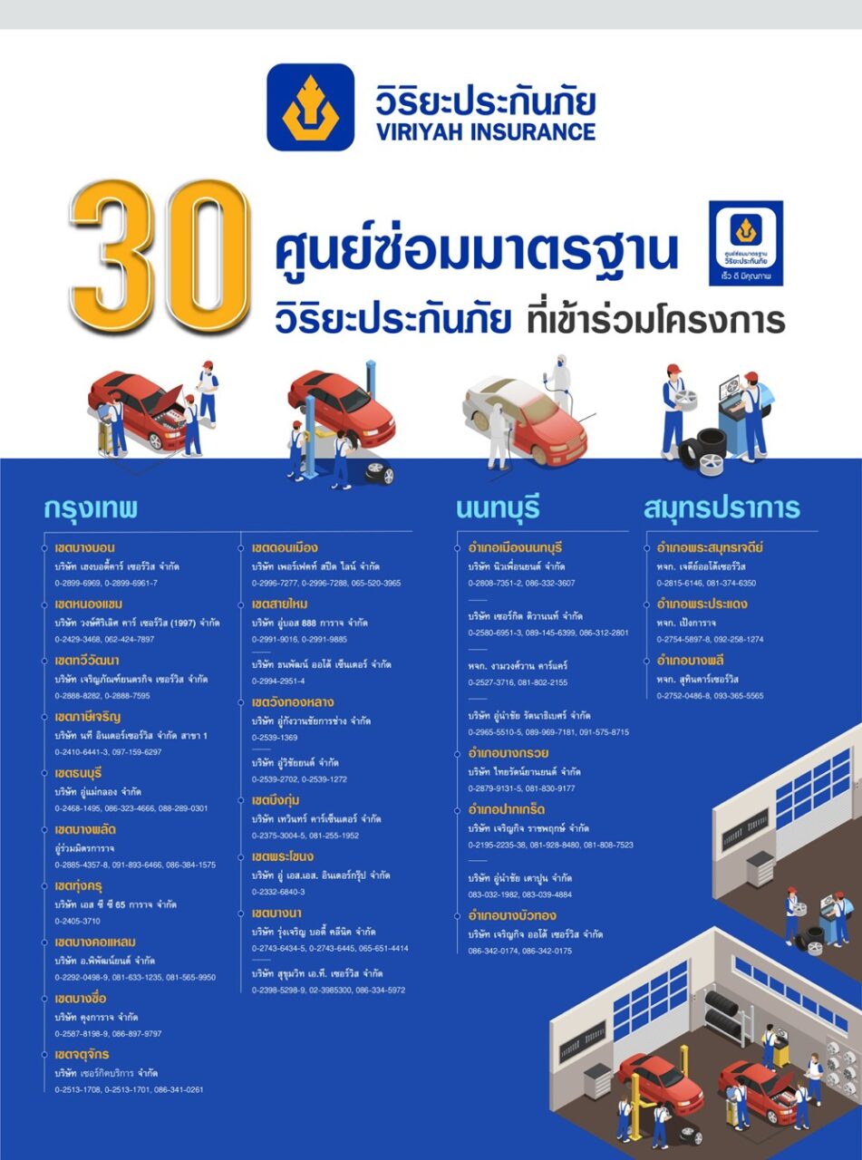 สำหรับศูนย์ซ่อมมาตรฐานวิริยะประกันภัยที่เข้าร่วมโครงการให้บริการตรวจรถฟรี จำนวน 30 แห่ง ได้แก่ 1) อู่ร่วมมิตรการาจ 2) บจ.นิวเพื่อนยนต์ 3) บจ.ไทยรัตน์ยานยนต์ 4) หจก. งามวงศ์วาน คาร์แคร์  5) บจ.อู่นำชัย รัตนาธิเบศร์ 6) บจ.เซอร์กิต ติวานนท์ 7) บจ.อู่นำชัย เตาปูน (สาขาติวานนท์) 8) บจ.เจริญกิจ ราชพฤกษ์ 9) บจ.เจริญกิจ ออโต้ เซอร์วิส 10) บจ. คุงการาจ 11) บจ.เซอร์กิตบริการ 12) บจ.อู่กังวานชัยการช่าง 13) บจ.อู่วิชัยยนต์ 14) บจ.เทวินทร์ คาร์เซ็นเตอร์ 15) อู่บอส 888 การาจ 16) บจ.ธนพัฒน์ ออโต้ เซ็นเตอร์ 17) บจ.เพอร์เฟคท์ สปีด ไลน์ 18) บจ.เอส ซี ซี 65 การาจ 19) หจก. เจดีย์ออโต้เซอร์วิส 20) หจก.เป้งการาจ 21) บจ. อู่ เอส.เอส. อินเตอร์กรุ๊ป 22) บจ.รุ่งเจริญ บอดี้ คลีนิค 23) บจ.สุขุมวิท เอ.ที. เซอร์วิส 24) หจก.สุทินคาร์เซอร์วิส 25) บจ.เฮงบอดี้คาร์ เซอร์วิส 26) บจ.วงษ์ศิริเลิศ คาร์ เซอร์วิส (1997) 27) บจ.เจริญภัณฑ์ยนตรกิจ เซอร์วิส 28) บจ.นที อินเตอร์เซอร์วิส สาขา 1 29) บจ.อู่แม่กลอง 30) บจ.อ.พิพัฒน์ยนต์ (1989)