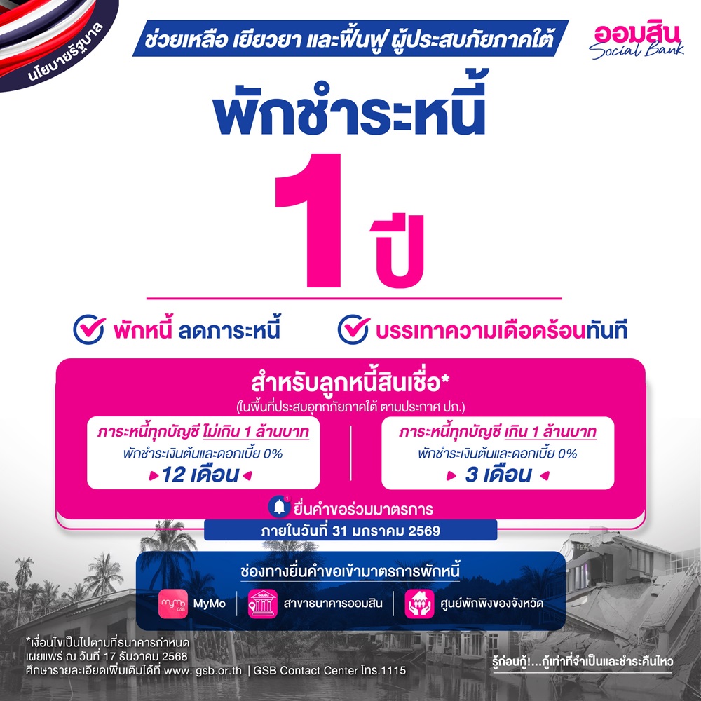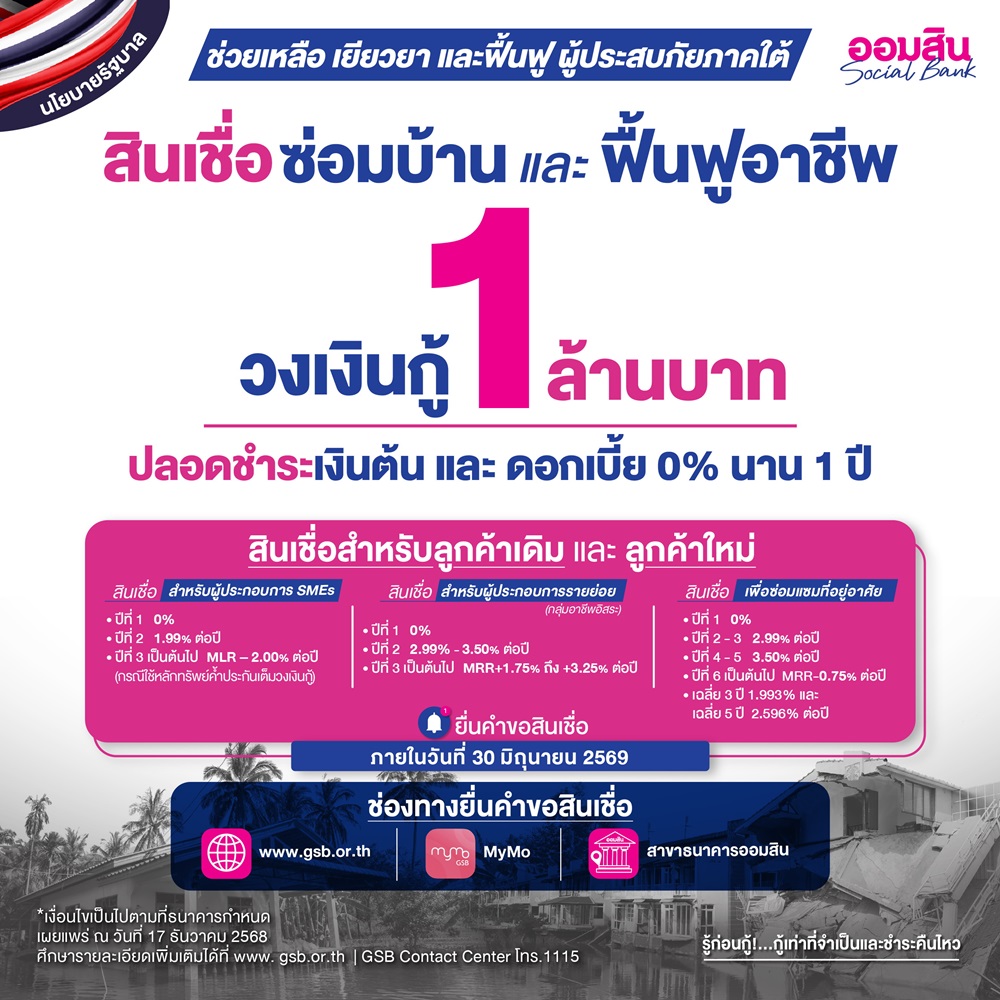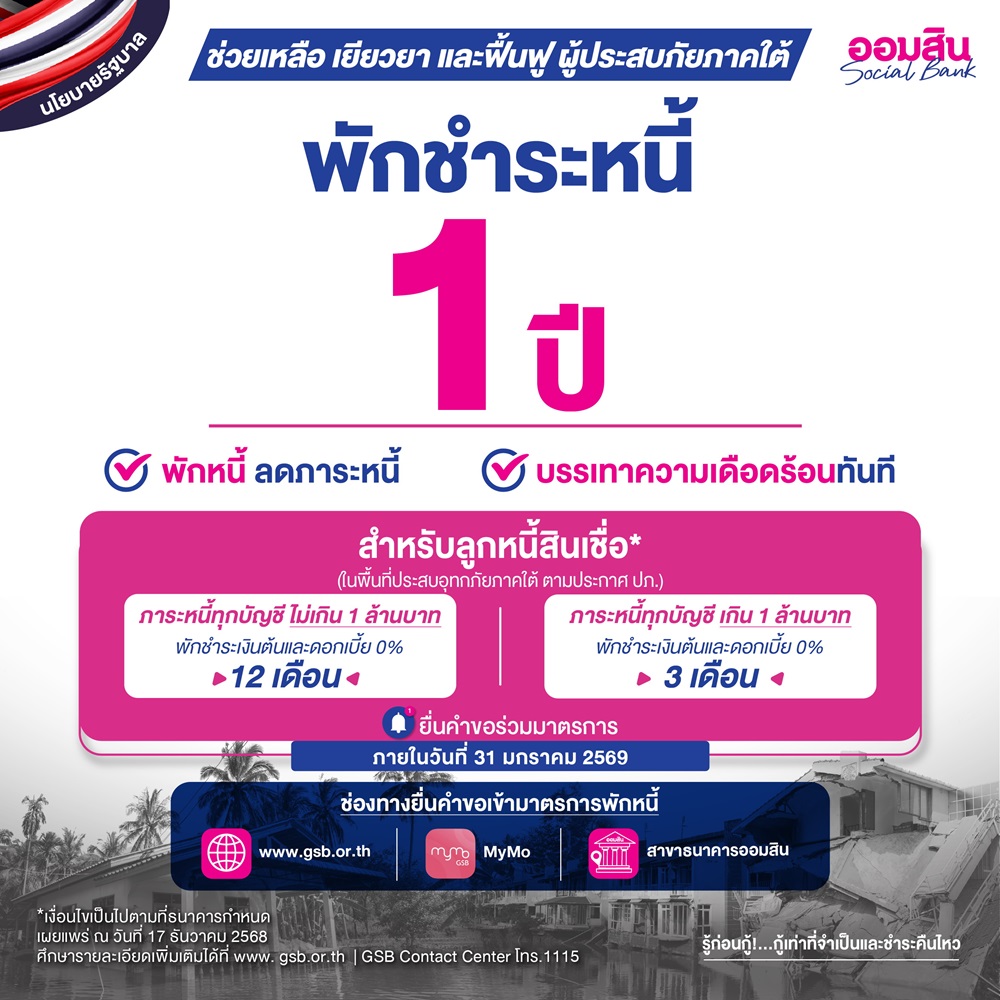 ออมสิน ออกมาตรการช่วยผู้ประสบภัยใต้ พักหนี้-ไม่คิดดอกเบี้ย กลุ่มไม่เกินล้าน นาน 12 เดือน ตามนโยบายรัฐ เติมมาตรการดูแลกลุ่มหนี้เกินล้านให้พักหนี้-ไม่คิดดอกเบี้ย นาน 3 เดือน พร้อมสินเชื่อเยียวยา ฟื้นฟู ดอกเบี้ย 0% ปีแรก