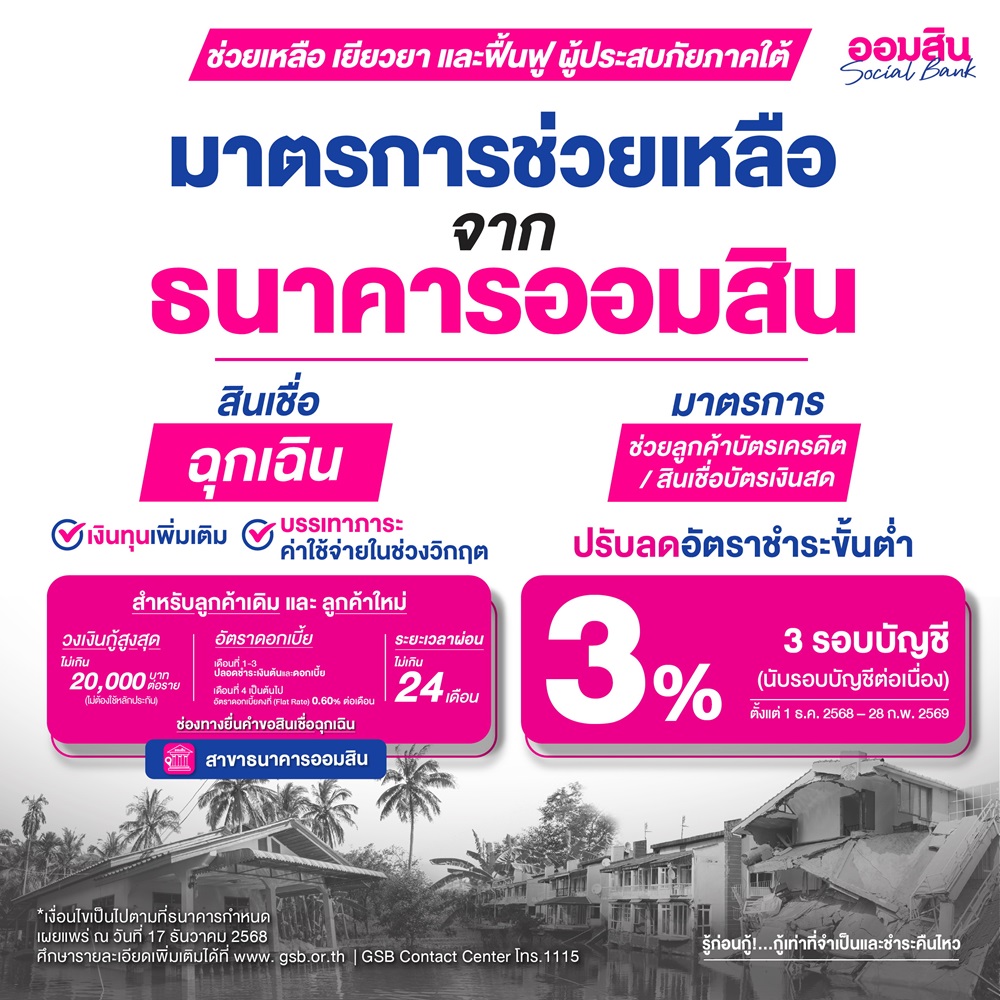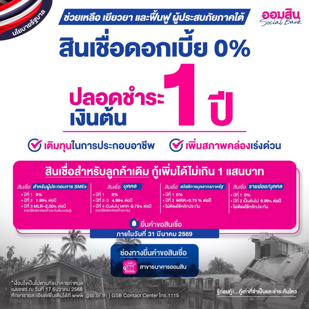 นางลภาวรรณ จันทร์กระจ่าง รองผู้อำนวยการธนาคารออมสิน รักษาการแทนผู้อำนวยการธนาคารออมสิน เปิดเผยว่า ตามมติคณะรัฐมนตรีเมื่อวันที่ 2 ธันวาคม 2568 เห็นชอบให้กระทรวงการคลังและสถาบันการเงินเฉพาะกิจเร่งออกมาตรการช่วยเหลือ เยียวยา ฟื้นฟูประชาชนที่ได้รับความเดือดร้อนจากอุทกภัยในพื้นที่ภาคใต้ตามประกาศของกรมป้องกันและบรรเทาสาธารณภัย (ปภ.) ธนาคารออมสินได้ออกชุดมาตรการทางการเงินที่ครอบคลุมกลุ่มลูกค้าเดิมและลูกค้าใหม่ ประกอบด้วย มาตรการพักชำระเงินต้นและไม่คิดดอกเบี้ย นาน 12 เดือนสำหรับลูกหนี้ที่มียอดหนี้ไม่เกิน 1 ล้านบาท ตามนโยบายรัฐ และจัดมาตรการเพิ่มเติมให้พักชำระเงินต้นและไม่คิดดอกเบี้ย นาน 3 เดือน สำหรับกลุ่มที่มียอดหนี้เกิน 1 ล้านบาท เพื่อหยุดภาระหนี้ทันทีในช่วงที่ยังต้องฟื้นฟูการดำรงชีพ พร้อมมาตรการสินเชื่ออัตราดอกเบี้ย 0% นาน 12 เดือน ช่วยประชาชนให้เข้าถึงแหล่งทุนในระบบสถาบันการเงินเพื่อเติมสภาพคล่องให้สามารถฟื้นตัวตั้งหลักได้โดยเร็ว
