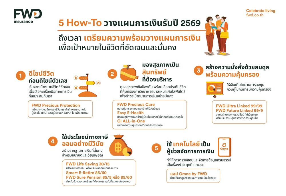 การก้าวเข้าสู่ปีใหม่คือช่วงเวลาที่ดีในการทบทวนเป้าหมายชีวิต และจัดระบบการเงินให้มั่นคง พร้อมรับโอกาส และความท้าทายในอนาคต ท่ามกลางเทรนด์ที่ผู้บริโภคมองหาเครื่องมือทางการเงินที่โปร่งใส เข้าใจง่าย และตอบโจทย์กับการใช้ชีวิตได้จริง ข้อมูลจากกระทรวงการคลังระบุว่า เศรษฐกิจไทยมีแนวโน้มจะขยายตัวในระดับ 2%[1] ในปี 2569 ซึ่งเป็นสัญญาณสำคัญให้ทุกคน “เตรียมความพร้อม” วางแผนทางการเงินอย่างรัดกุม เพื่อสร้างความมั่งคั่งให้เติบโตตามเป้าหมายที่ตั้งไว้ FWD ประกันชีวิต ขอแนะนำวิธีคิดที่ทำให้การวางแผนทางการเงินสำหรับชีวิตเป็นเรื่องที่ทำได้เอง โดยใช้ประกันชีวิตเป็นอีกหนึ่งในเครื่องมือทางการเงิน ที่ช่วยเสริมพลังให้ไปถึงเป้าหมายได้สำเร็จด้วยความมั่นใจ