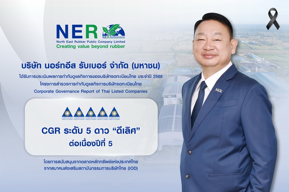 บริษัท นอร์ทอีส รับเบอร์ จำกัด (มหาชน) หรือ NER ผู้ดำเนินธุรกิจผลิตและจำหน่าย ยางแผ่นรมควัน ยางแท่ง ยางผสม และสินค้าปลายน้ำแผ่นยางพาราปูพื้น คุณภาพสูง เพื่อจำหน่ายไปยังผู้ผลิตในอุตสาหกรรมยานยนต์ กลุ่มผู้ค้าคนกลางทั้งในประเทศและต่างประเทศ ได้รับคะแนนการประเมินการกำกับดูแลกิจการในระดับ 5 ดาว หรือ ระดับ “ดีเลิศ” (Excellent CG Scoring) ต่อเนื่องเป็นปีที่ 5 จากผลการสำรวจโครงการสำรวจการกำกับดูแลกิจการบริษัทจดทะเบียนไทยประจำปี 2568 Corporate Governance Report of Thai Listed Companies 2025 (CGR 2025) ซึ่งมีบริษัทจดทะเบียนเข้าร่วมการประเมินรวมทั้งสิ้น 844 บริษัท ของสมาคมส่งเสริมสถาบันกรรมการบริษัทไทย (IOD) โดยการสนับสนุนจากตลาดหลักทรัพย์แห่งประเทศไทย (ตลท.) และสำนักงานคณะกรรมการกำกับหลักทรัพย์และตลาดหลักทรัพย์ (ก.ล.ต.)