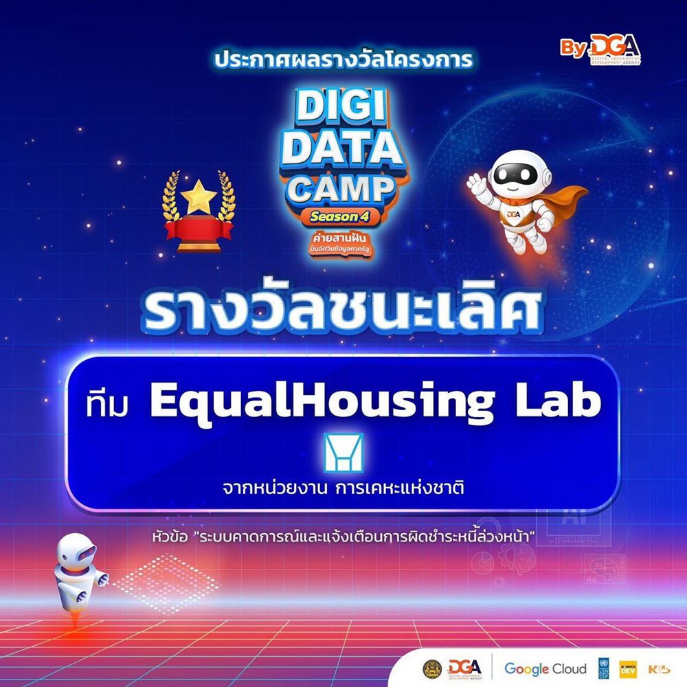 การเคหะแห่งชาติ สร้างผลงานโดดเด่น ในระดับประเทศจากการเข้าร่วมการแข่งขันด้านการใช้เทคโนโลยีปัญญาประดิษฐ์เพื่อการวิเคราะห์ข้อมูล (AI for Data Analytics) ภายใต้โครงการ DIGI Data Camp Season 4 จัดโดยสำนักงานพัฒนารัฐบาลดิจิทัล (องค์การมหาชน) หรือ DGA ซึ่งมีผู้เข้าร่วมแข่งขันกว่า 465 ทีมจากทั่วประเทศ