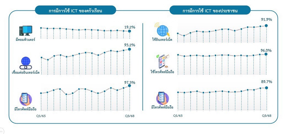 นางหทัยชนก ชินอุปราวัฒน์ รองผู้อำนวยการสำนักงานสถิติแห่งชาติ เปิดเผยผลการสำรวจการมีการใช้ ICT ในครัวเรือน ในไตรมาส 3 ปี 2568 จากครัวเรือนส่วนบุคคลตัวอย่าง 86,880 ครัวเรือนทั่วประเทศ พบว่า“การมีการใช้ ICT ของประชาชนที่มีอายุ 6 ปีขึ้นไปและในระดับครัวเรือน ยังคงมีแนวโน้มเพิ่มขึ้น ในทุกมิติยกเว้นการมีคอมพิวเตอร์ของครัวเรือน ที่มีแนวโน้มลดลงตามการเปลี่ยนแปลงทางเทคโนโลยี ของโทรศัพท์มือถือที่เข้ามามีบทบาทในการใช้งานทดแทนคอมพิวเตอร์ได้ในหลายกิจกรรม”