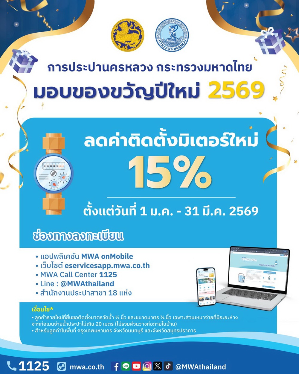 สำหรับโครงการ “กปน. ร่วมใจลดภาระติดตั้งมิเตอร์ใหม่” กปน. มอบส่วนลด 15 % ค่าติดตั้งประปาใหม่ สำหรับลูกค้ารายใหม่ในพื้นที่กรุงเทพมหานคร นนทบุรี และสมุทรปราการ สำหรับมาตรวัดน้ำขนาดเส้นผ่านศูนย์กลาง ½ นิ้ว และ ¾ นิ้ว เฉพาะส่วนเหมาจ่ายที่มีระยะห่างจากท่อเมนจ่ายน้ำประปาไม่เกิน 20 เมตร (ไม่รวมส่วนวางท่อภายในบ้าน) ตั้งแต่วันที่ 1 มกราคม – 31 มีนาคม 2569 โดยลูกค้าสามารถยื่นเรื่องเพื่อขอติดตั้งประปาใหม่ได้ทั้ง 5 ช่องทาง คือ แอปพลิเคชัน MWA onMobile / เว็บไซต์ eservicesapp.mwa.co.th / MWA call center โทร. 1125 / line : @MWAthailand และสำนักงานประปาสาขาทั้ง 18 แห่ง สอบถามข้อมูลเพิ่มเติมได้ที่ MWA call center โทร. 1125 ตลอด 24 ชั่วโมง หรือทาง line : @MWAthailand