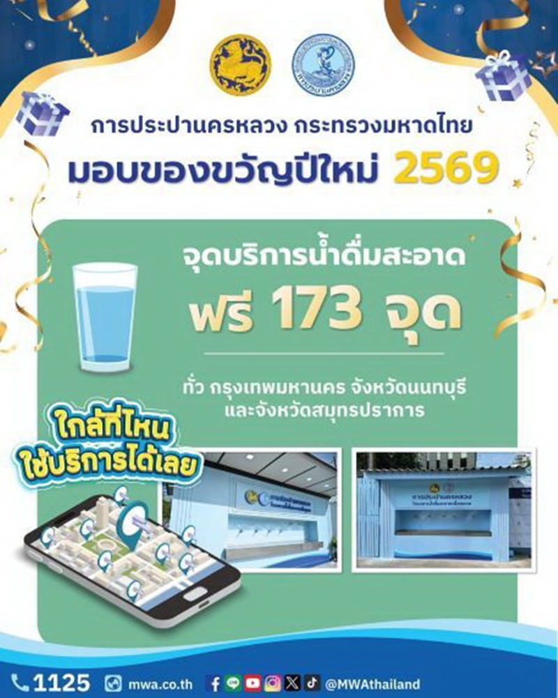 นางสาวสุวรา ทวิชศรี ผู้ว่าการการประปานครหลวง (กปน.) กล่าวว่า ตามที่กระทรวงมหาดไทยได้จัดทำโครงการของขวัญปีใหม่ของกระทรวงมหาดไทยเพื่อมอบให้ประชาชน ประจำปี พ.ศ. 2569 กปน. ขอส่งความสุขให้ประชาชนร่วมกับกระทรวงมหาดไทย ด้วยการมอบของขวัญปีใหม่ให้ประชาชน 2 โครงการ ได้แก่ “กปน. ร่วมใจลดภาระติดตั้งมิเตอร์ใหม่” และ “โครงการน้ำดื่มสะอาดเพื่อชุมชน” เพื่อช่วยลดรายจ่ายและส่งเสริมคุณภาพชีวิตประชาชนให้ได้รับน้ำประปาที่สะอาดปลอดภัยสำหรับใช้อุปโภค/ บริโภค