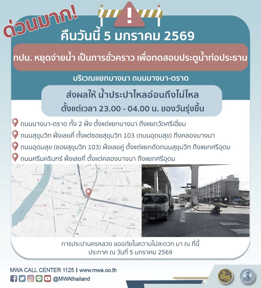การประปานครหลวง (กปน.) ขอแจ้งให้ทราบว่า จะดำเนินการทดสอบประตูน้ำท่อประธาน ในพื้นที่บริเวณแยกบางนา ถนนบางนา-ตราด เพื่อให้ประชาชนได้รับบริการน้ำประปาอย่างเพียงพอและทั่วถึง จึงมีความจำเป็นต้องหยุดจ่ายน้ำ เป็นการชั่วคราว ในคืนวันนี้ (วันจันทร์ที่ 5 มกราคม 2569) ตั้งแต่เวลา 23.00 – 04.00 น. ของวันรุ่งขึ้น โดยระหว่างดำเนินการ ส่งผลให้ น้ำประปาไหลอ่อนถึงไม่ไหล ในพื้นที่ดังต่อไปนี้