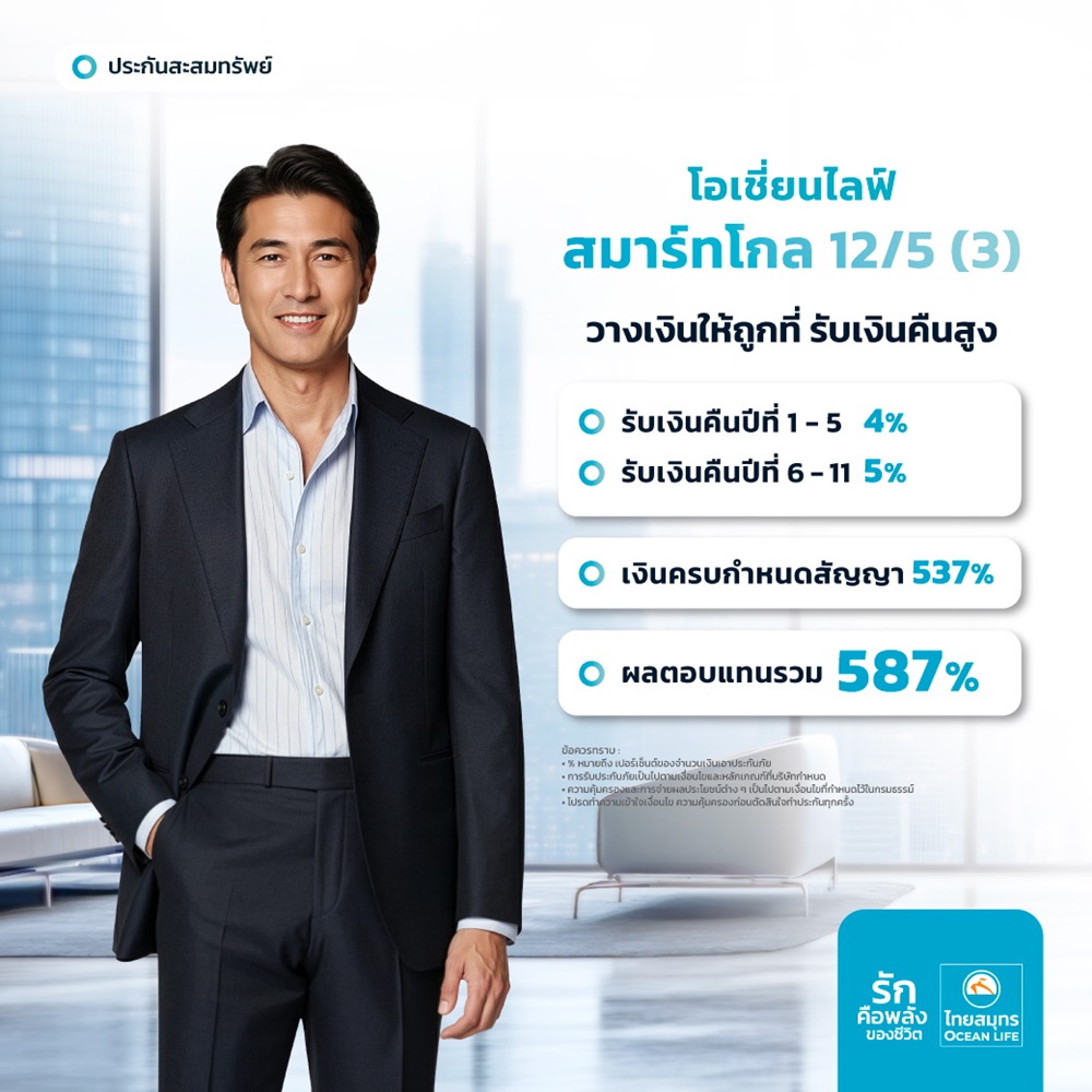 บมจ.ไทยสมุทรประกันชีวิต รักคือพลังของชีวิต โดยคุณนุสรา (อัสสกุล) บัญญัติปิยพจน์ ประธานเจ้าหน้าที่บริหารและกรรมการผู้จัดการ (CEO) กล่าวว่า ในยุคที่โลกมีการเปลี่ยนแปลงอย่างรวดเร็ว เศรษฐกิจและทิศทางการลงทุนมีความผันผวน การรับมือที่ดีที่สุดคือการเตรียมพร้อมที่ปรับเปลี่ยนให้ทันท่วงทีเพื่อรับผลประโยชน์ที่ดีที่สุด OCEAN LIFE ไทยสมุทร มีความตั้งใจและมุ่งมั่นพัฒนาผลิตภัณฑ์ให้ตอบโจทย์ความต้องการของลูกค้า เปิดตัวผลิตภัณฑ์ใหม่ โอเชี่ยนไลฟ์ สมาร์ท โกล 12/5 (3) ประกันออมทรัพย์ที่ให้ครบทั้งความคุ้มครองชีวิตและลดหย่อนภาษี ชูจุดเด่น รับผลตอบแทนสูง รับเงินคืนทุกปี เป็นทางเลือกในการออมเงินและการลงทุนในรูปแบบประกันชีวิตระยะสั้นที่ได้รับได้เงินคืนทุกปี สามารถนำเงินคืนมาใช้ลงทุนต่อ และยังได้รับความคุ้มครองชีวิต เพื่อปิดความเสี่ยงให้ครอบครัวและคนที่รักอีกด้วย