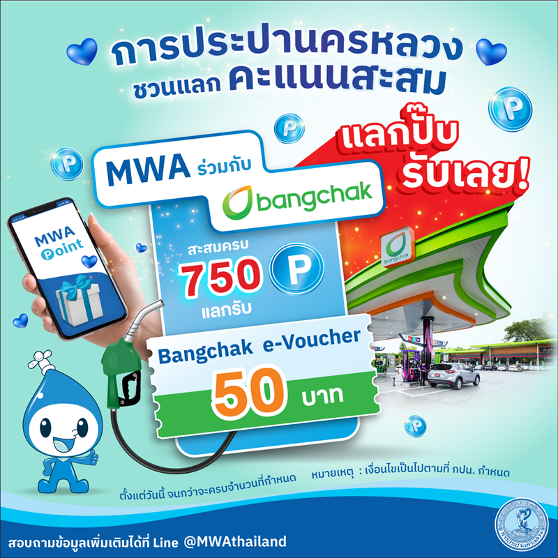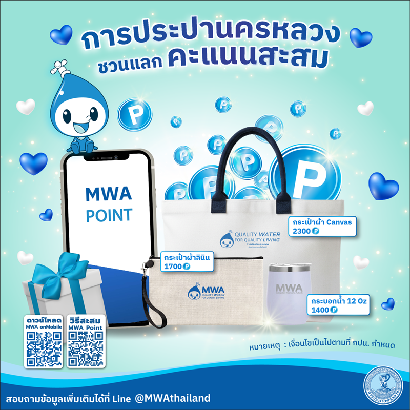 รับแต้มง่ายๆ เพียงใช้บริการออนไลน์หรือสมัคร MWA e-Bill Service เพื่อแลกของรางวัลสุดพิเศษ ทั้ง e-Voucher และของพรีเมียมสุดน่ารักอย่าง กระเป๋า และกระบอกน้ำ มาเริ่มต้นปีใหม่ด้วยความสุขและสิทธิพิเศษดี ๆ ไปด้วยกันตลอดทั้งปี