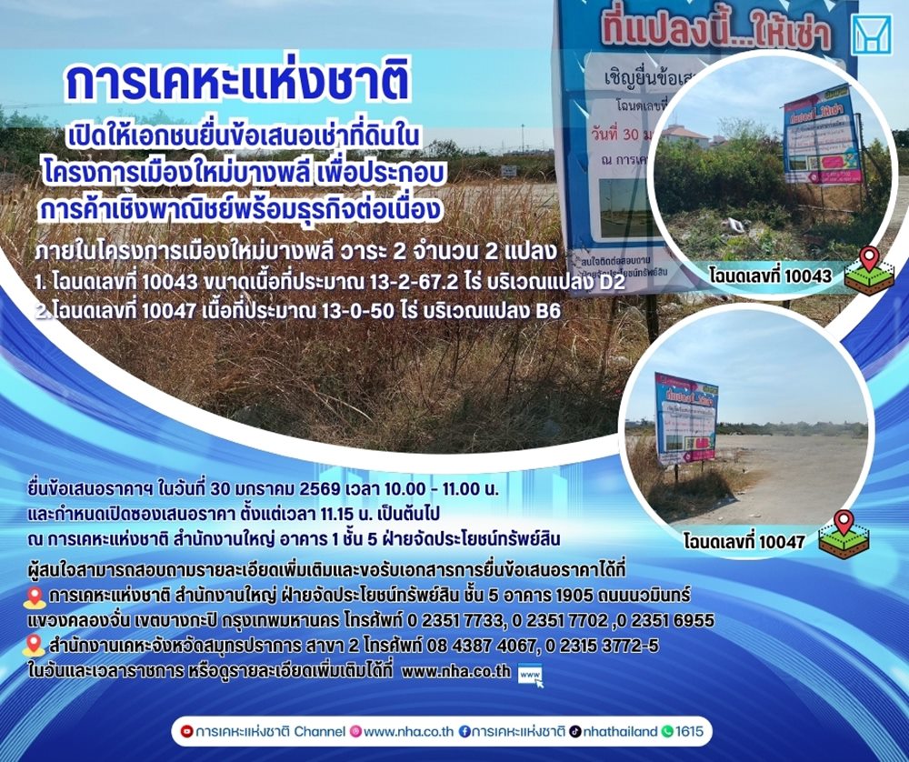 และ 2.) โฉนดเลขที่ 10047 ขนาดเนื้อที่ประมาณ 13-0-50 ไร่ บริเวณแปลง B6 โดยมีอัตราค่าธรรมเนียมการได้สิทธิเช่าขั้นต่ำไม่น้อยกว่า 4,000,000 บาท ระยะเวลาการให้สิทธิเช่า 15 ปี (ทำสัญญาคราวเดียว) ในอัตราค่าเช่ารายเดือน ปีที่ 1-3 เดือนละ 264,000 บาท (ปลอดค่าเช่า 6 เดือนแรก) ปีที่ 4-6 เดือนละ 291,000 บาท ปีที่ 7-9 เดือนละ 321,000 บาท ปีที่ 10-12 เดือนละ 354,000 บาท ปีที่ 13-15 เดือนละ 390,000 บาท กำหนดหลักประกันการยื่นซองเสนอราคาจำนวน 100,000 บาท กำหนดเงินประกันการปฏิบัติตามสัญญา เป็นเงิน 1,170,000 บาท โดยทั้ง 2 แปลง ดังกล่าว กำหนดวันยื่นข้อเสนอราคา ในวันที่ 30 มกราคม 2569 เวลา 10.00 – 11.00 น. และกำหนดเปิดซองเสนอราคา ตั้งแต่เวลา 11.15 น. เป็นต้นไป ณ การเคหะแห่งชาติ สำนักงานใหญ่ อาคาร 1 ชั้น 5 ฝ่ายจัดประโยชน์ทรัพย์สิน แขวงคลองจั่น เขตบางกะปิ กรุงเทพมหานคร
