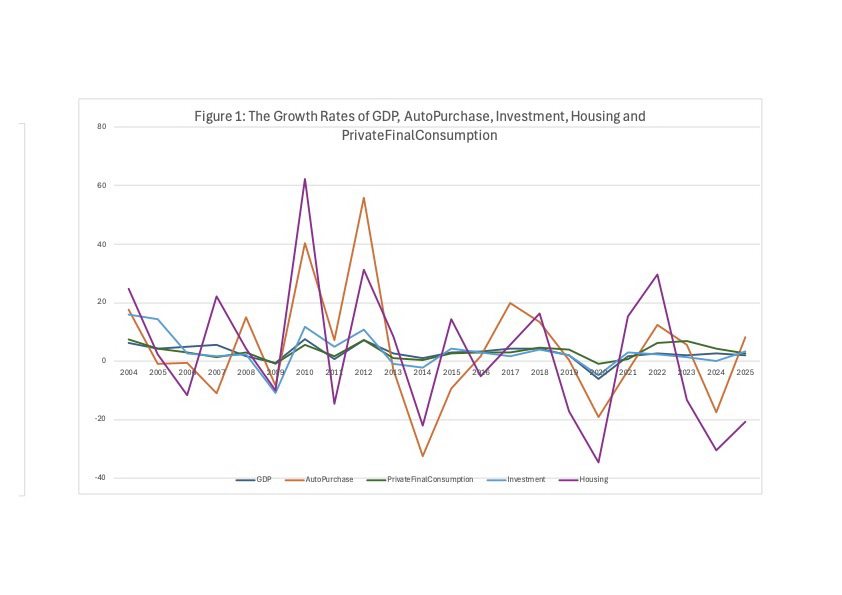 เมื่อดูจาก Figure 1 แล้ว จะเห็นได้ว่าภาวะของการลงทุนกับรายได้ประชาชาติแปรผันตามวัฏจักร  ในขณะเดียวกัน จำนวนที่อยู่อาศัยและรถยนต์ที่ขายได้ก็แปรผันตามวัฏจักรเดียวกัน จีดีพีและการบริโภคของเศรษฐกิจไทยค่อนข้างมีอัตราขยายตัวสม่ำเสมอที่ระดับ 3% ต่อปี มีเพียงการลงทุนเท่านั้นที่คาดเดาได้ยากและมีความผันผวนตามผลกระทบทางการเมืองที่เกิดขึ้น   ทิศทางทางการเมืองไทยก็ดูเหมือนจะคาดเดาได้ยากในปี 2569  อย่างไรก็ตาม ทิศทางของภาวะตลาดที่อยู่อาศัยอย่างน้อยที่สุดควรจะเป็นบวกในปี 2569 แม้ว่าอาจจะไม่มากถึงขนาดเฟื่องฟูก็ตาม