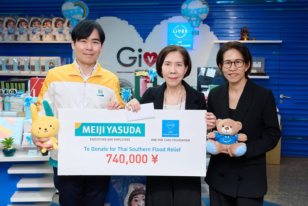 คณะผู้บริหารและพนักงาน บริษัท เมจิ ยาสุดะ ไลฟ์อินชัวรันส์ ร่วมสมทบทุนช่วยเหลือ ผู้ประสบอุทกภัยภาคใต้ ผ่าน มูลนิธิหนึ่งคนให้ หลายคนรับ จำนวน 740,000 เยน (ประมาณ 146,000 บาท)